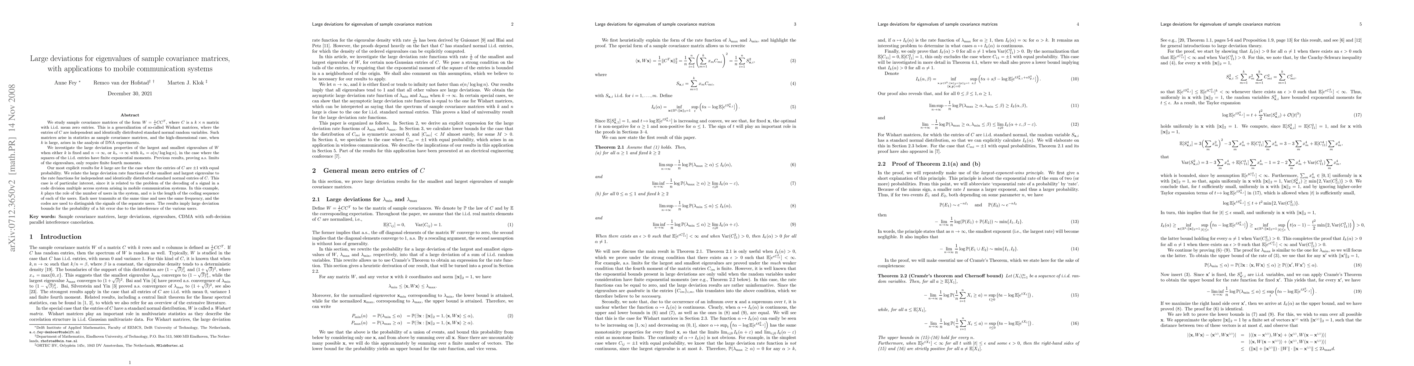 This paper investigates the large deviation properties of eigenvalues in sample covariance matrices $W=\frac 1n CC^T$, with applications to mobile communication systems. It focuses on the largest and smallest eigenvalues' behavior in high dimensions, establishing rate functions that relate to the decoding efficiency in code division multiple access systems.