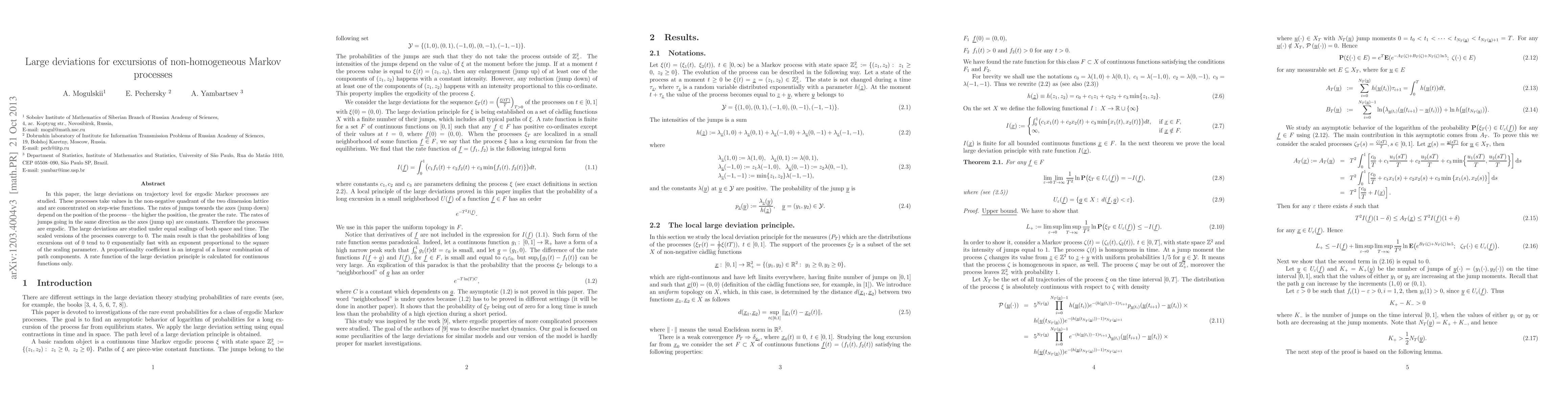 In this paper, the large deviations on trajectory level for ergodic Markov processes are studied. These processes take values in the non-negative quadrant of the two dimension lattice and are concentrated on step-wise functions. The rates of jumps towards the axes (jump down) depend on the position of the process -- the higher the position, the greater the rate. The rates of jumps going in the same direction as the axes (jump up) are constants. Therefore the processes are ergodic. The large deviations are studied under equal scalings of both space and time. The scaled versions of the processes converge to 0. The main result is that the probabilities of long excursions out of 0 tend to 0 exponentially fast with an exponent proportional to the square of the scaling parameter. A proportionality coefficient is an integral of a linear combination of path components. A rate function of the large deviation principle is calculated for continuous functions only.