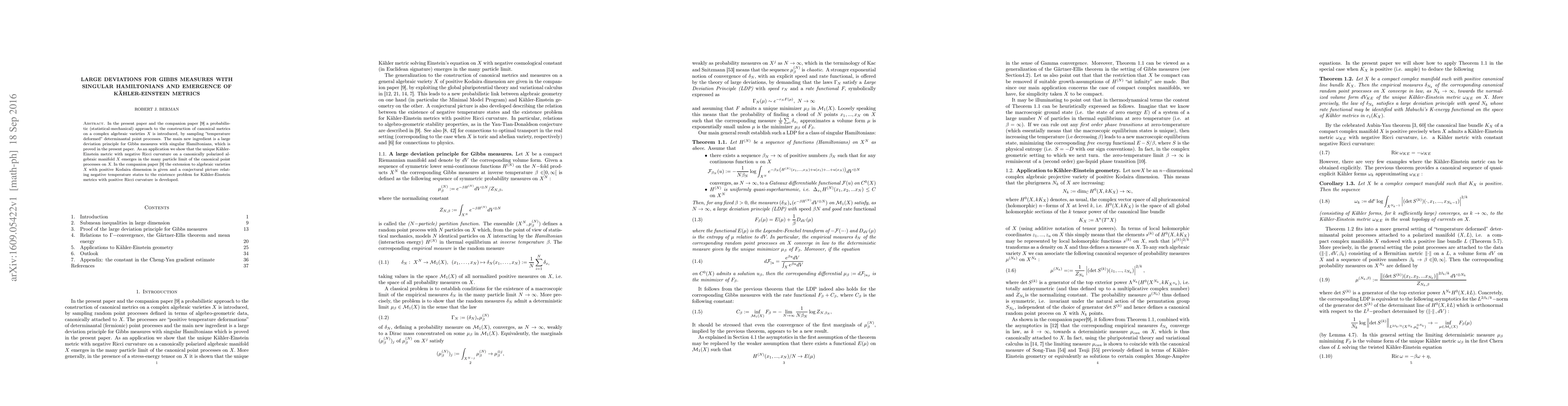 In the present paper and the companion paper [9] a probabilistic (statistical-mechanical) approach to the construction of canonical metrics on a complex algebraic varieties X is introduced, by sampling "temperature deformed" determinantal point processes. The main new ingredient is a large deviation principle for Gibbs measures with singular Hamiltonians, which is proved in the present paper. As an application we show that the unique Kahler-Einstein metric with negative Ricci curvature on a canonically polarized algebraic manifold X emerges in the many particle limit of the canonical point processes on X. In the companion paper [9] the extension to algebraic varieties X with positive Kodaira dimension is given and a conjectural picture relating negative temperature states to the existence problem for Kahler-Einstein metrics with positive Ricci curvature is developed.
