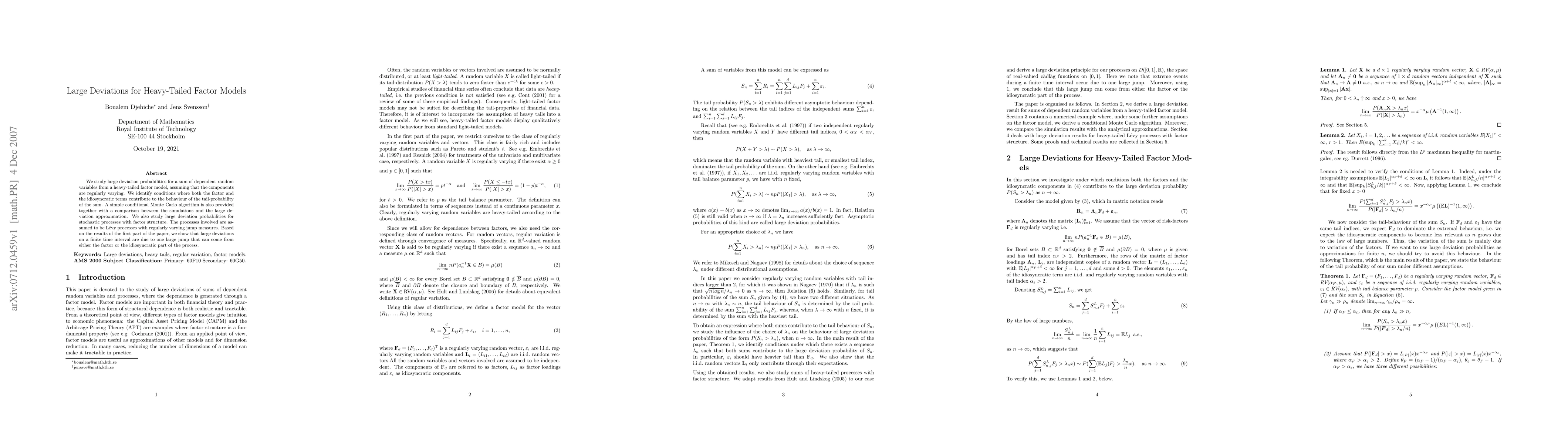 This paper investigates large deviation probabilities for sums of dependent random variables from heavy-tailed factor models, identifying conditions where both factor and idiosyncratic terms influence tail behavior. It also proposes a conditional Monte Carlo algorithm for approximation and examines large deviations in Levy processes with factor structure, attributing deviations to significant jumps from either component.