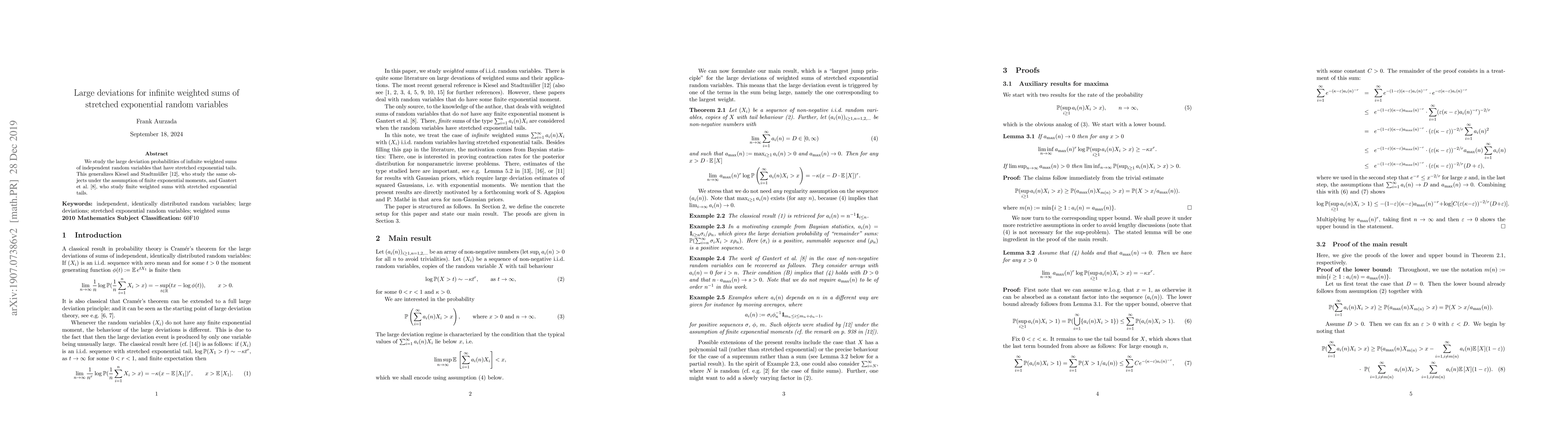 This paper investigates large deviation probabilities for infinite weighted sums of independent random variables with stretched exponential tails, extending previous work that required finite exponential moments. It generalizes results from Kiesel and Stadtmüller (2000) and Gantert et al. (2014).