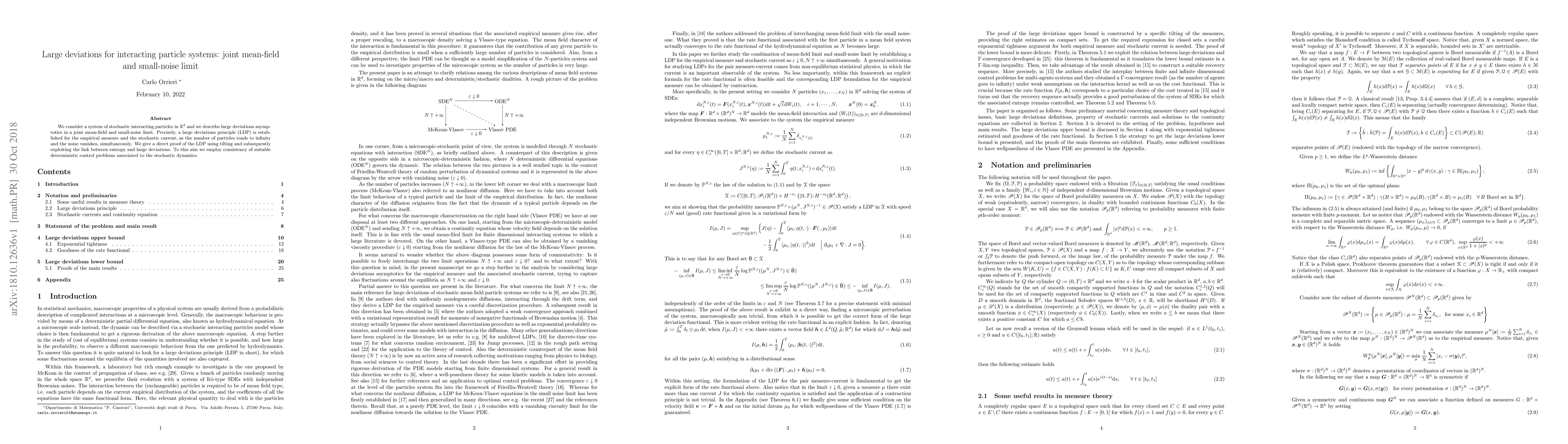 This paper establishes a large deviations principle for a system of stochastic interacting particles in $\mathbb{R}^d$ under a joint mean-field and small-noise limit. The authors provide a direct proof using tilting and entropy-based methods, leveraging deterministic control problems to achieve their results.