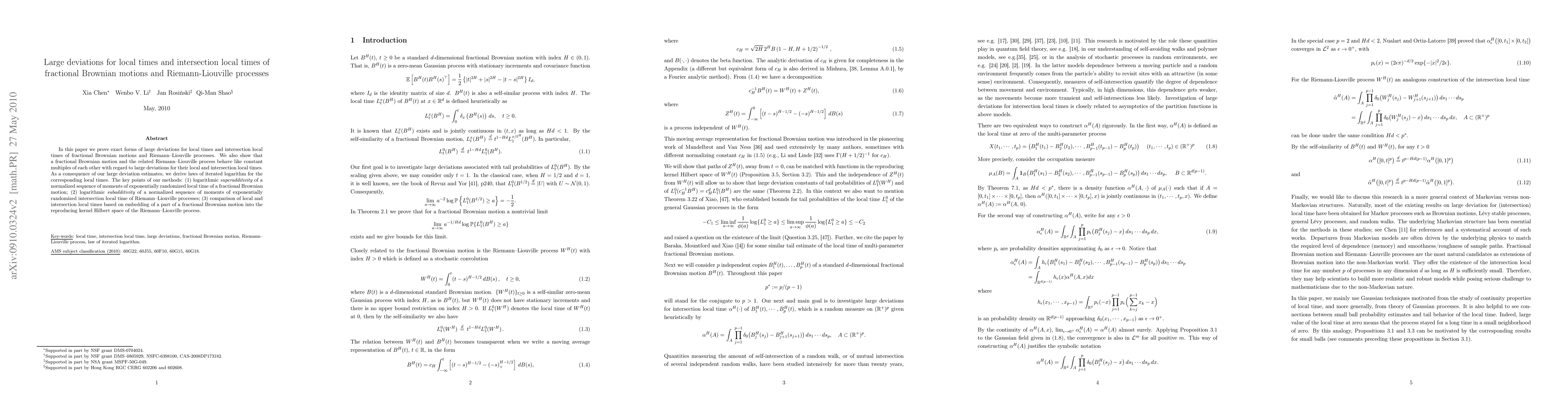 This paper establishes large deviation principles for local times and intersection local times of fractional Brownian motions and Riemann-Liouville processes, demonstrating their proportional behavior and deriving laws of iterated logarithm. Key methods include the logarithmic superadditivity of fractional Brownian motion's local time and the logarithmic subadditivity of Riemann-Liouville processes' intersection local time.