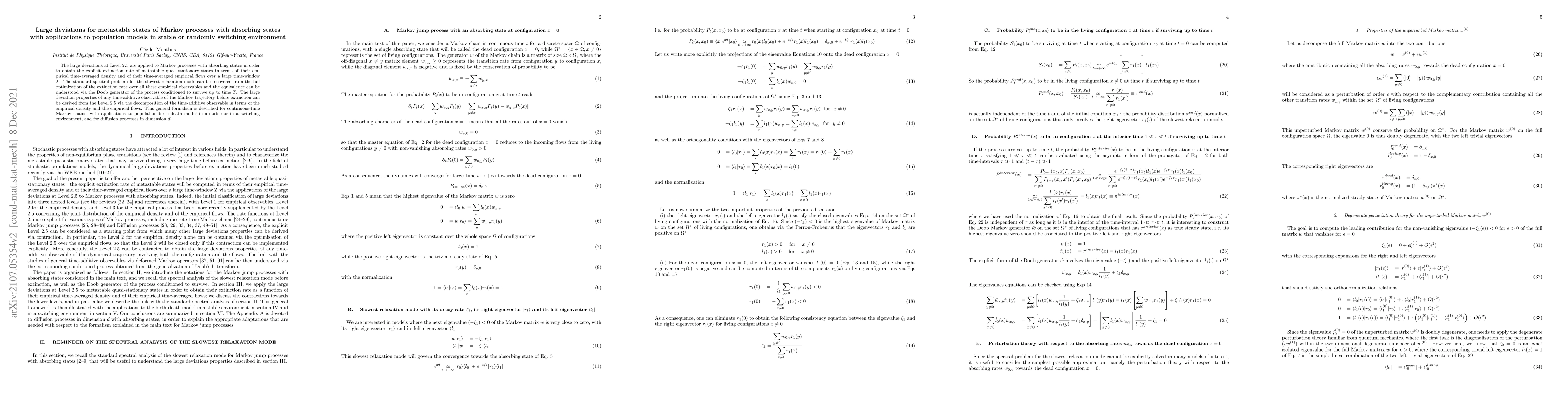 This paper applies large deviations to Markov processes with absorbing states to derive the extinction rate of metastable quasi-stationary states, linking it to empirical density and flow. It extends this formalism to population models in stable or switching environments, providing insights into their dynamics.
