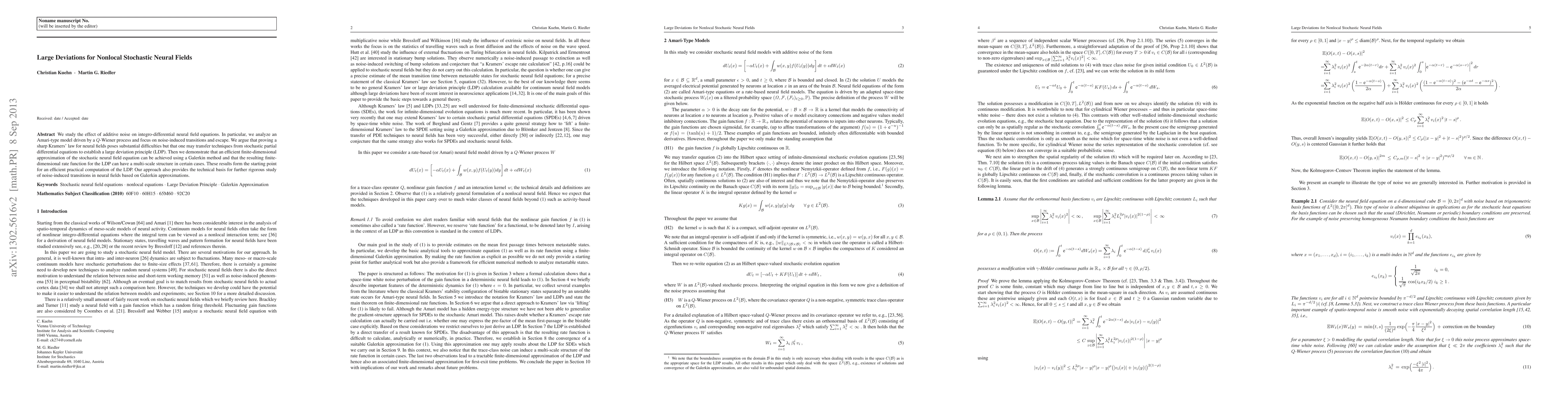 This paper investigates the impact of additive noise on integro-differential neural field equations, focusing on noise-induced transitions and escape in an Amari-type model driven by a $Q$-Wiener process. The authors propose using techniques from stochastic partial differential equations to establish a large deviation principle and demonstrate a Galerkin method for efficient finite-dimensional approximation.