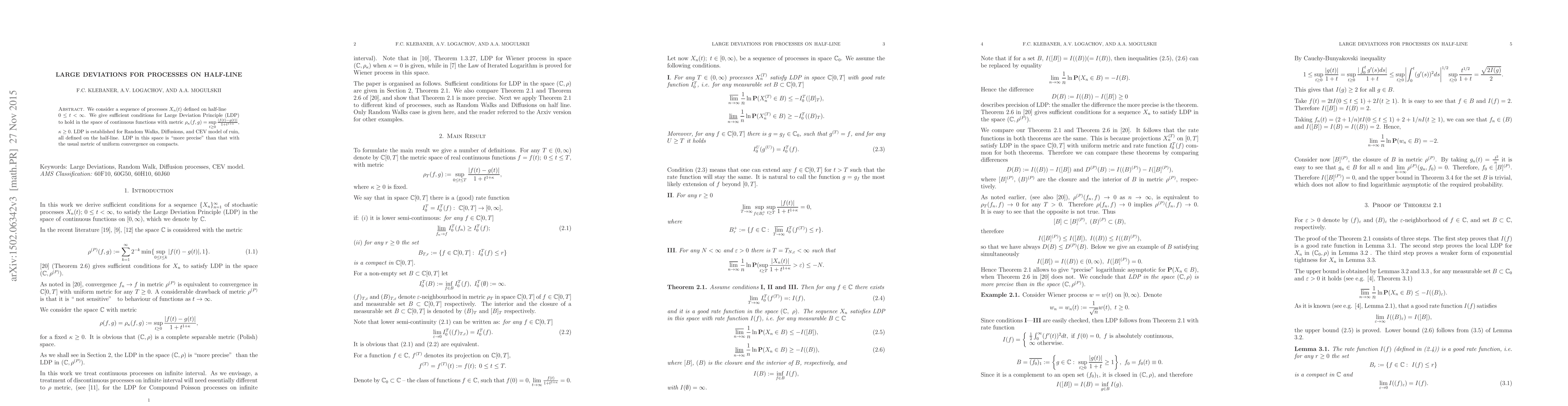 We consider a sequence of processes defined on half-line for all non negative t. We give sufficient conditions for Large Deviation Principle (LDP) to hold in the space of continuous functions with a new metric that is more sensitive to behaviour at infinity than the uniform metric. LDP is established for Random Walks, Diffusions, and CEV model of ruin, all defined on the half-line. LDP in this space is "more precise" than that with the usual metric of uniform convergence on compacts.