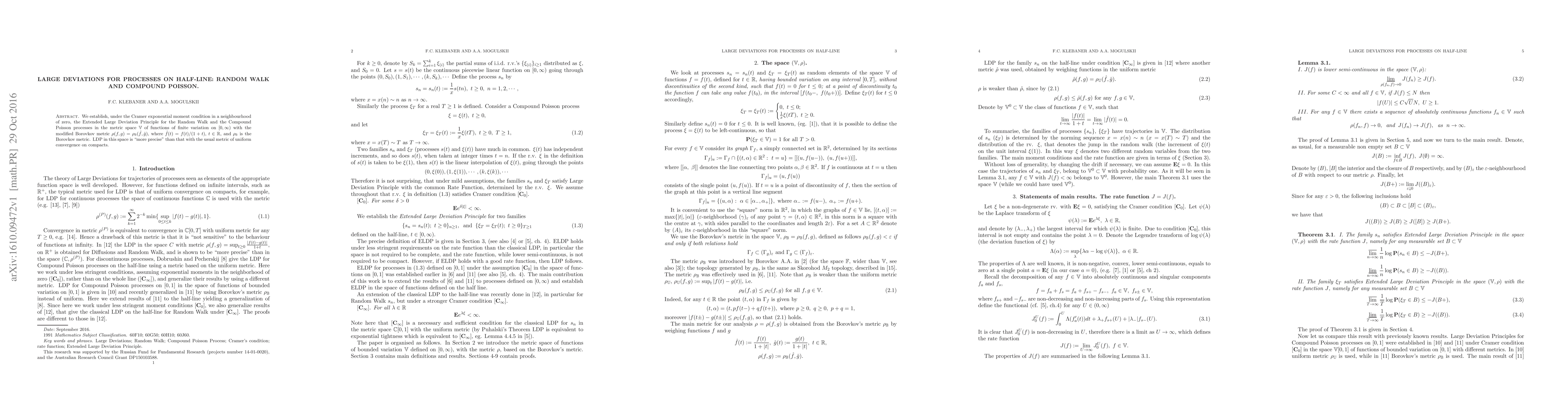 We establish, under the Cramer exponential moment condition in a neighbourhood of zero, the Extended Large Deviation Principle for the Random Walk and the Compound Poisson processes in the metric space $\V$ of functions of finite variation on $[0,\infty)$ with the modified Borovkov metric $\r(f,g)= \r_\B(\hat{f},\hat{g}) $, where $ \hat f(t)= f(t)/(1+t)$, $t\in \R$, and $\r_\B$ is the Borovkov metric. LDP in this space is "more precise" than that with the usual metric of uniform convergence on compacts.