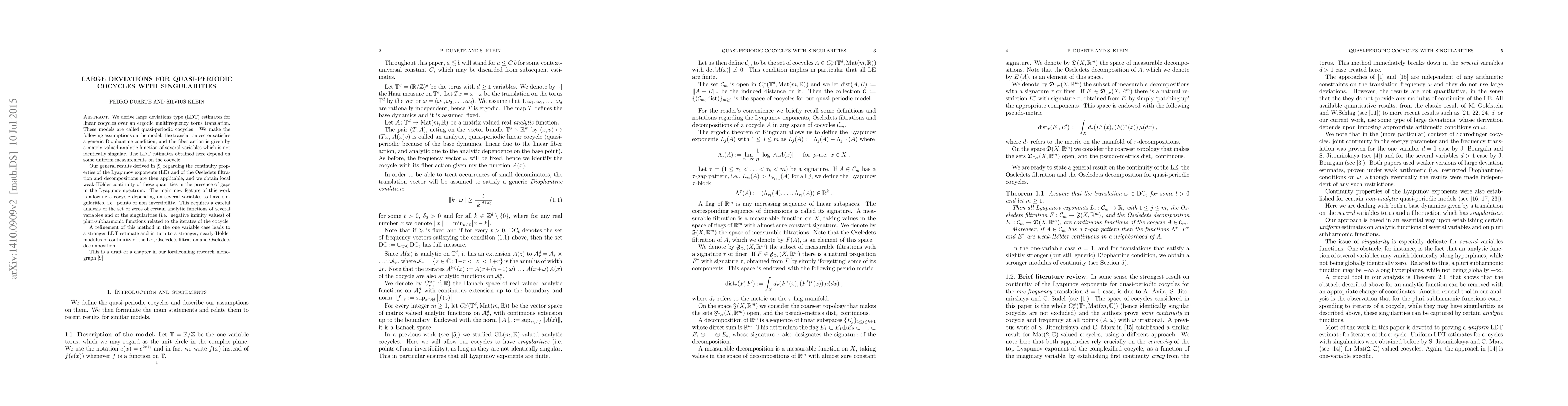 We derive large deviations type (LDT) estimates for linear cocycles over an ergodic multifrequency torus translation. These models are called quasi-periodic cocycles. We make the following assumptions on the model: the translation vector satisfies a generic Diophantine condition, and the fiber action is given by a matrix valued analytic function of several variables which is not identically singular. The LDT estimates obtained here depend on some uniform measurements on the cocycle. Our general results derived in [9] regarding the continuity properties of the Lyapunov exponents (LE) and of the Oseledets filtration and decompositions are then applicable, and we obtain local weak-Holder continuity of these quantities in the presence of gaps in the Lyapunov spectrum. The main new feature of this work is allowing a cocycle depending on several variables to have singularities, i.e. points of non invertibility. This requires a careful analysis of the set of zeros of certain analytic functions of several variables and of the singularities (i.e. negative infinity values) of pluri-subharmonic functions related to the iterates of the cocycle. A refinement of this method in the one variable case leads to a stronger LDT estimate and in turn to a stronger, nearly-Holder modulus of continuity of the LE, Oseledets filtration and Oseledets decomposition. This is a draft of a chapter in our forthcoming research monograph [9].