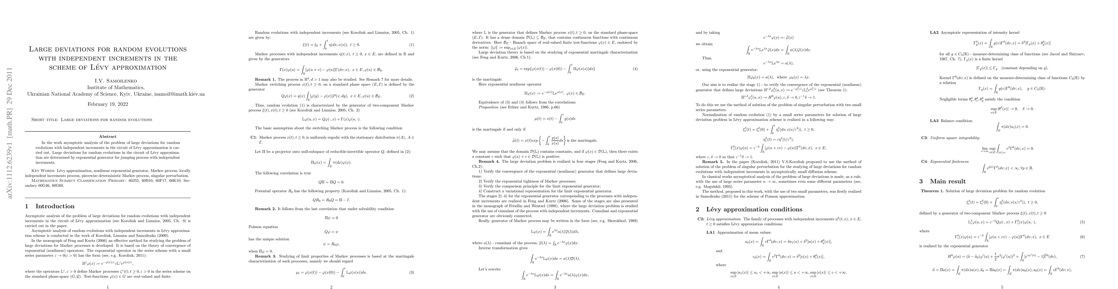 Summary: This paper conducts an asymptotic analysis of large deviations in random evolutions with independent increments, framed within the context of Lévy approximation. The study identifies the exponential generator for the jumping process as the key determinant of large deviations.