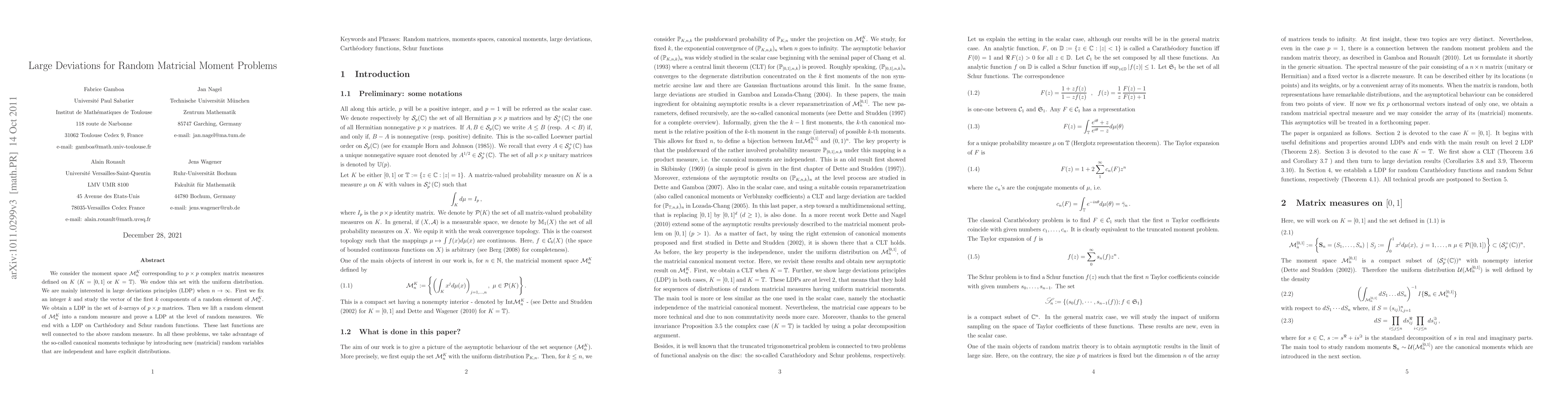 We consider the moment space $\mathcal{M}_n^{K}$ corresponding to $p \times p$ complex matrix measures defined on $K$ ($K=[0,1]$ or $K=\D$). We endow this set with the uniform law. We are mainly interested in large deviations principles (LDP) when $n \rightarrow \infty$. First we fix an integer $k$ and study the vector of the first $k$ components of a random element of $\mathcal{M}_n^{K}$. We obtain a LDP in the set of $k$-arrays of $p\times p$ matrices. Then we lift a random element of $\mathcal{M}_n^{K}$ into a random measure and prove a LDP at the level of random measures. We end with a LDP on Carth\'eodory and Schur random functions. These last functions are well connected to the above random measure. In all these problems, we take advantage of the so-called canonical moments technique by introducing new (matricial) random variables that are independent and have explicit distributions.
