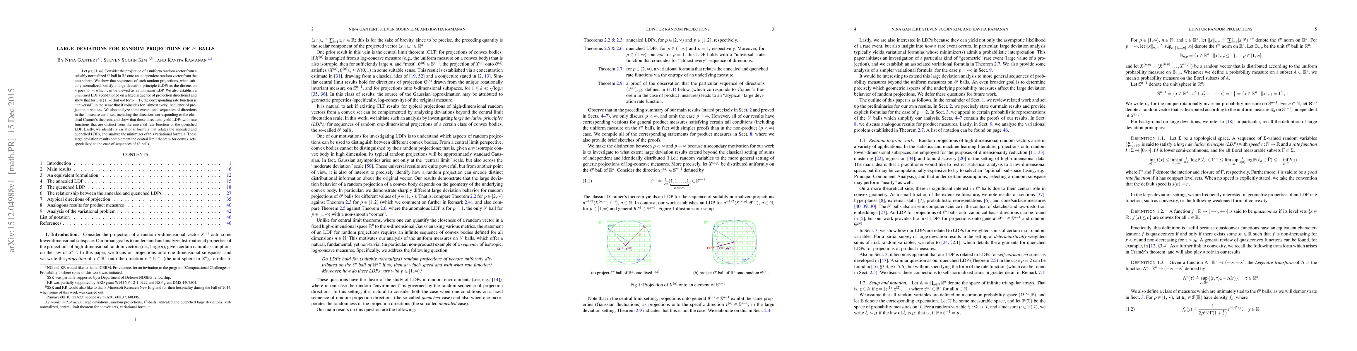 Let $p\in[1,\infty]$. Consider the projection of a uniform random vector from a suitably normalized $\ell^p$ ball in $\mathbb{R}^n$ onto an independent random vector from the unit sphere. We show that sequences of such random projections, when suitably normalized, satisfy a large deviation principle (LDP) as the dimension $n$ goes to $\infty$, which can be viewed as an annealed LDP. We also establish a quenched LDP (conditioned on a fixed sequence of projection directions) and show that for $p\in(1,\infty]$ (but not for $p=1$), the corresponding rate function is "universal", in the sense that it coincides for "almost every" sequence of projection directions. We also analyze some exceptional sequences of directions in the "measure zero" set, including the directions corresponding to the classical Cram\'er's theorem, and show that those directions yield LDPs with rate functions that are distinct from the universal rate function of the quenched LDP. Lastly, we identify a variational formula that relates the annealed and quenched LDPs, and analyze the minimizer of this variational formula. These large deviation results complement the central limit theorem for convex sets, specialized to the case of sequences of $\ell^p$ balls.