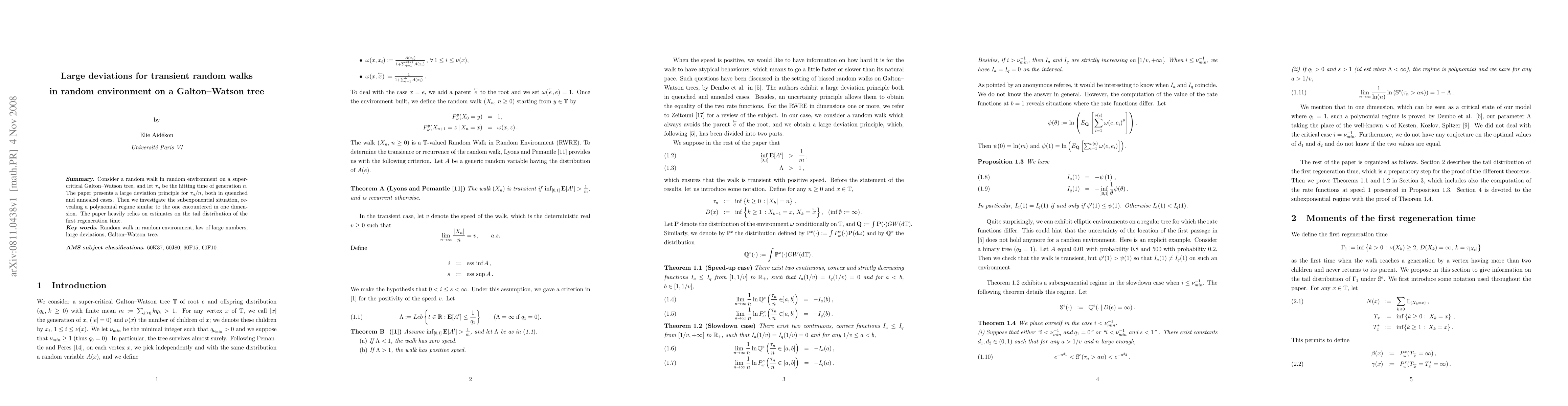This paper establishes a large deviation principle for the normalized hitting time of generations in a random walk on a supercritical Galton-Watson tree, examining both quenched and annealed scenarios. It also explores subexponential behavior, identifying a polynomial regime akin to one-dimensional cases, with key insights derived from the tail distribution of the first regeneration time.