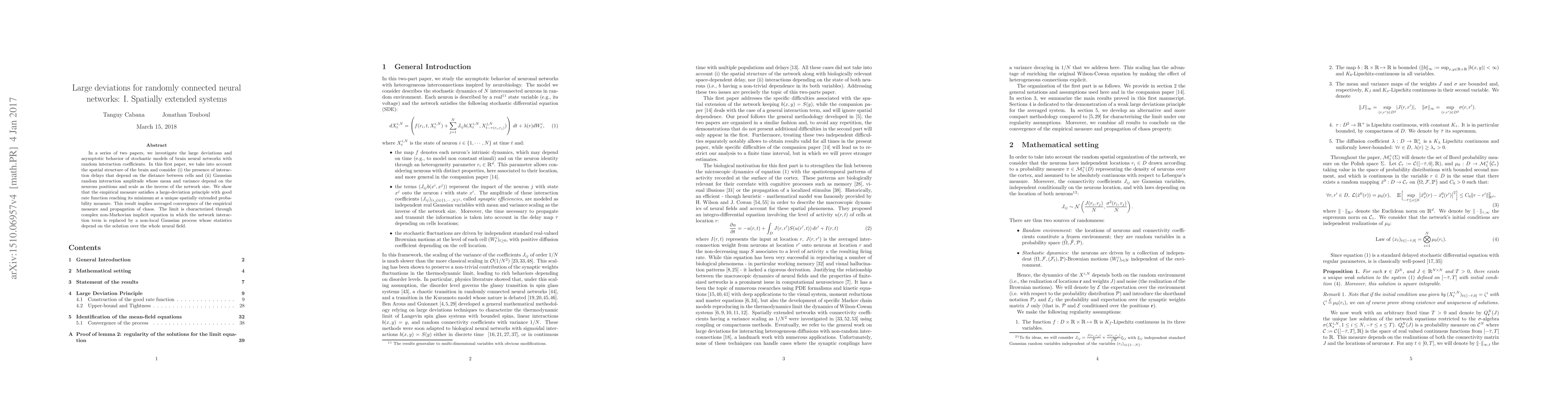 In a series of two papers, we investigate the large deviations and asymptotic behavior of stochastic models of brain neural networks with random interaction coefficients. In this first paper, we take into account the spatial structure of the brain and consider (i) the presence of interaction delays that depend on the distance between cells and (ii) Gaussian random interaction amplitude whose mean and variance depend on the neurons positions and scale as the inverse of the network size. We show that the empirical measure satisfies a large-deviation principle with good rate function reaching its minimum at a unique spatially extended probability measure. This result implies averaged convergence of the empirical measure and propagation of chaos. The limit is characterized through complex non-Markovian implicit equation in which the network interaction term is replaced by a non-local Gaussian process whose statistics depend on the solution over the whole neural field.