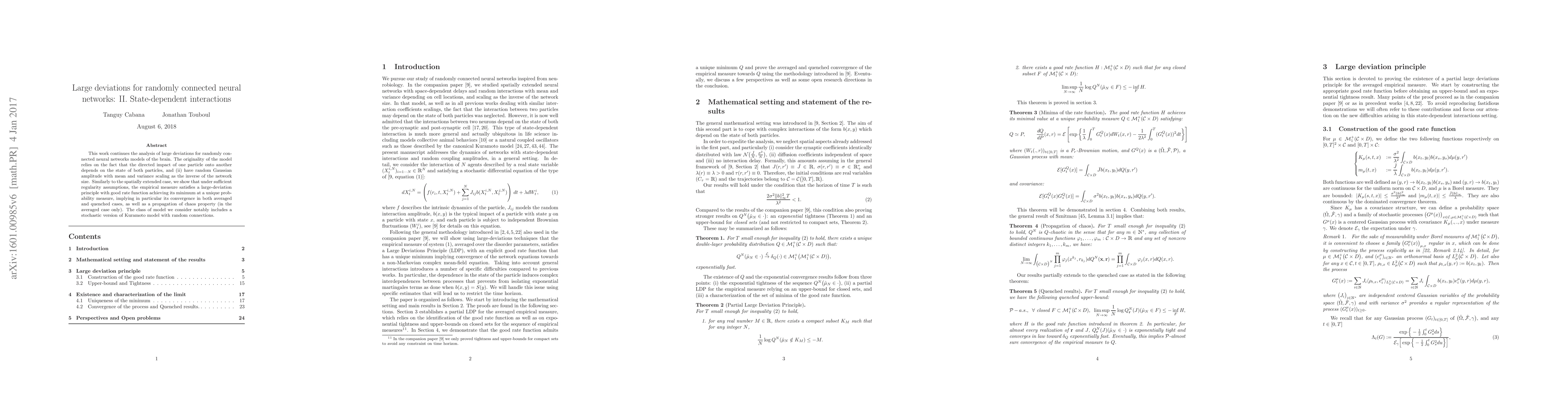 This work continues the analysis of large deviations for randomly connected neural networks models of the brain. The originality of the model relies on the fact that the directed impact of one particle onto another depends on the state of both particles, and (ii) have random Gaussian amplitude with mean and variance scaling as the inverse of the network size. Similarly to the spatially extended case, we show that under sufficient regularity assumptions, the empirical measure satisfies a large-deviation principle with good rate function achieving its minimum at a unique probability measure, implying in particular its convergence in both averaged and quenched cases, as well as a propagation of chaos property (in the averaged case only). The class of model we consider notably includes a stochastic version of Kuramoto model with random connections.
