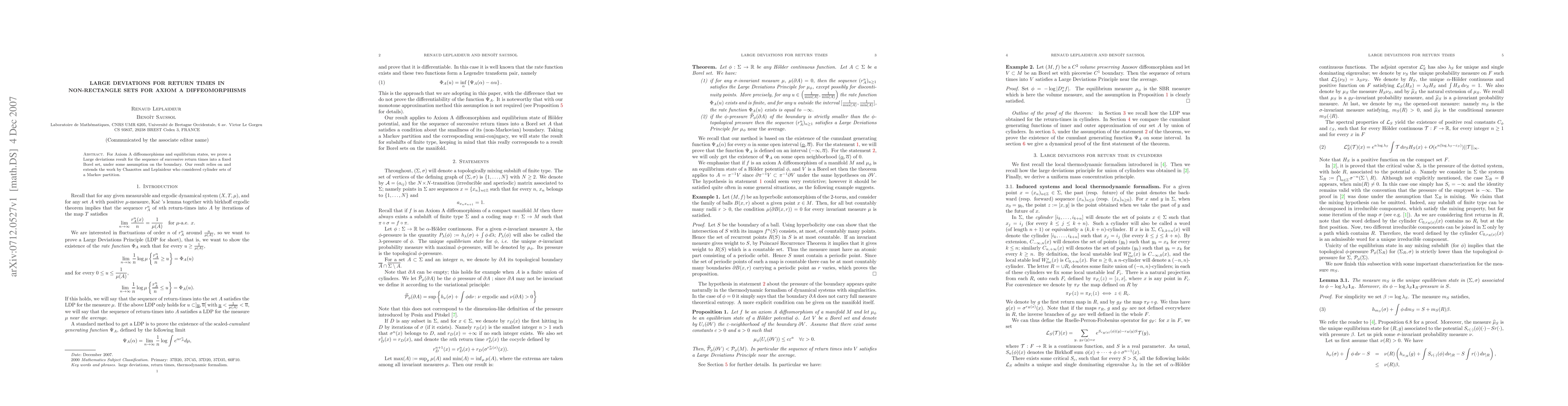 This paper proves a large deviations principle for the return times of Axiom A diffeomorphisms into non-rectangle Borel sets, extending previous results for Markov partition cylinder sets. It relies on assumptions about the boundary behavior of the sets.