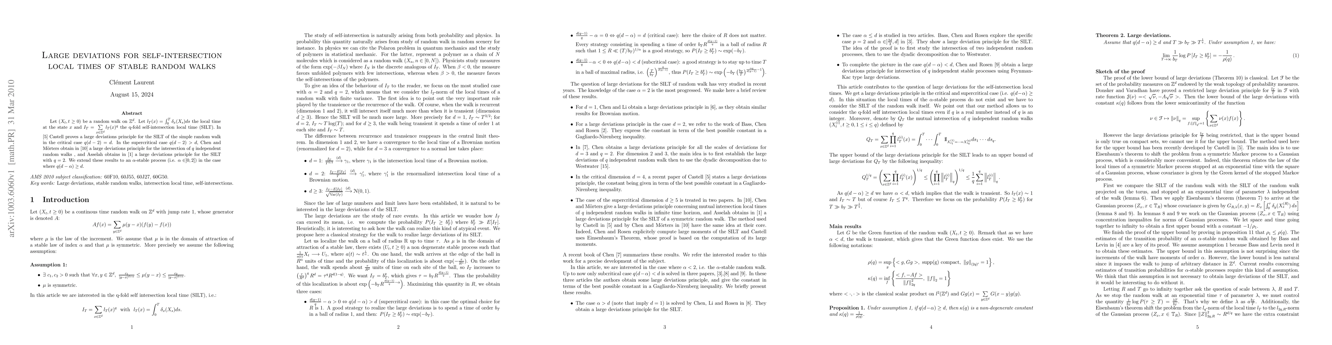 This paper extends large deviations principles for self-intersection local times of random walks to $\alpha$-stable processes, focusing on the critical and supercritical cases where $q(d-\alpha)\geq d$. Previous results for simple random walks and independent random walks are generalized to stable processes.