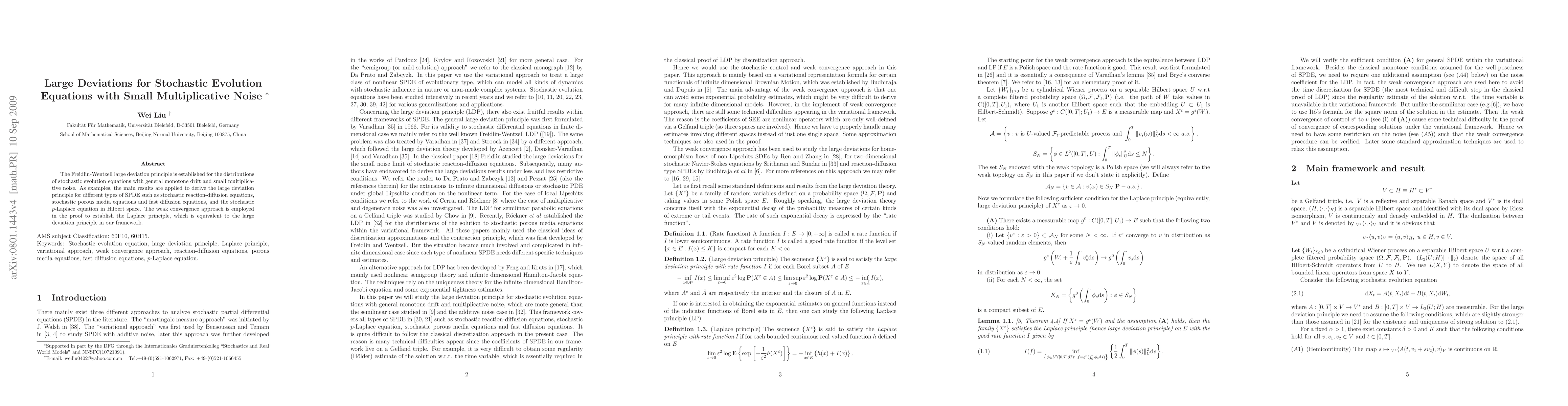 This paper establishes the Freidlin-Wentzell large deviation principle for stochastic evolution equations with general monotone drift and small multiplicative noise, applying it to various SPDEs like reaction-diffusion and porous media equations. The proof utilizes a weak convergence approach to derive the Laplace principle.