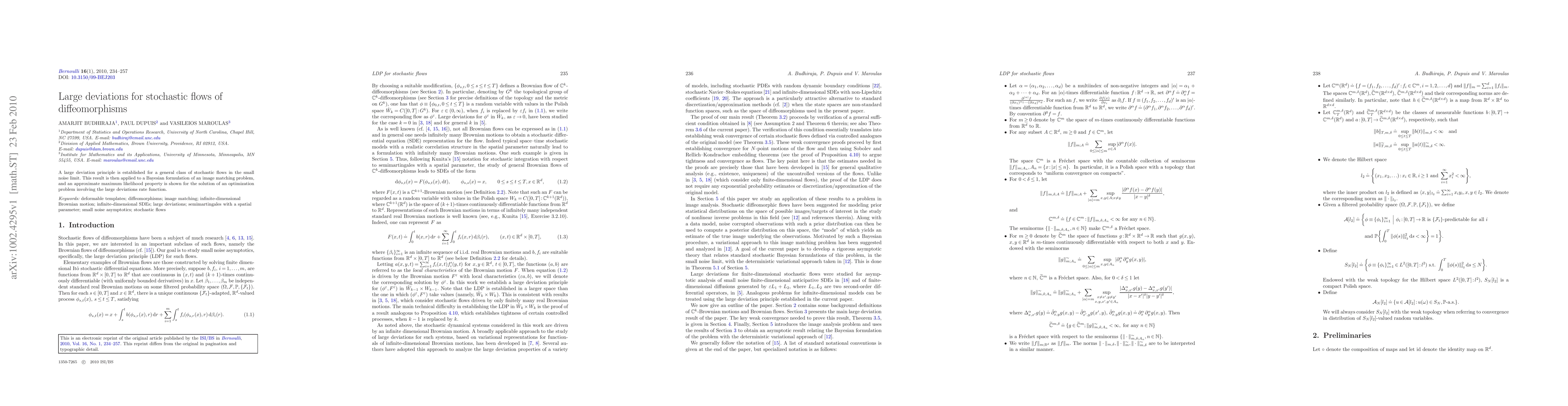 This paper establishes a large deviation principle for stochastic flows of diffeomorphisms, applying it to a Bayesian image matching problem to demonstrate an approximate maximum likelihood property for optimization solutions.