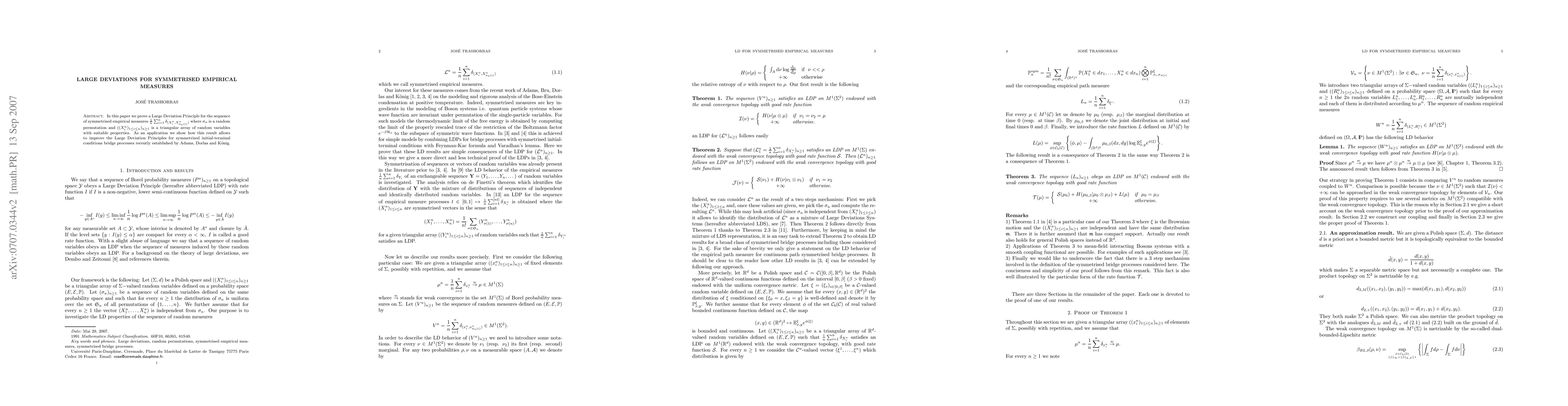This paper establishes a Large Deviation Principle for symmetrised empirical measures derived from random permutations of a triangular array of random variables. The results are applied to enhance the Large Deviation Principles for symmetrised bridge processes.