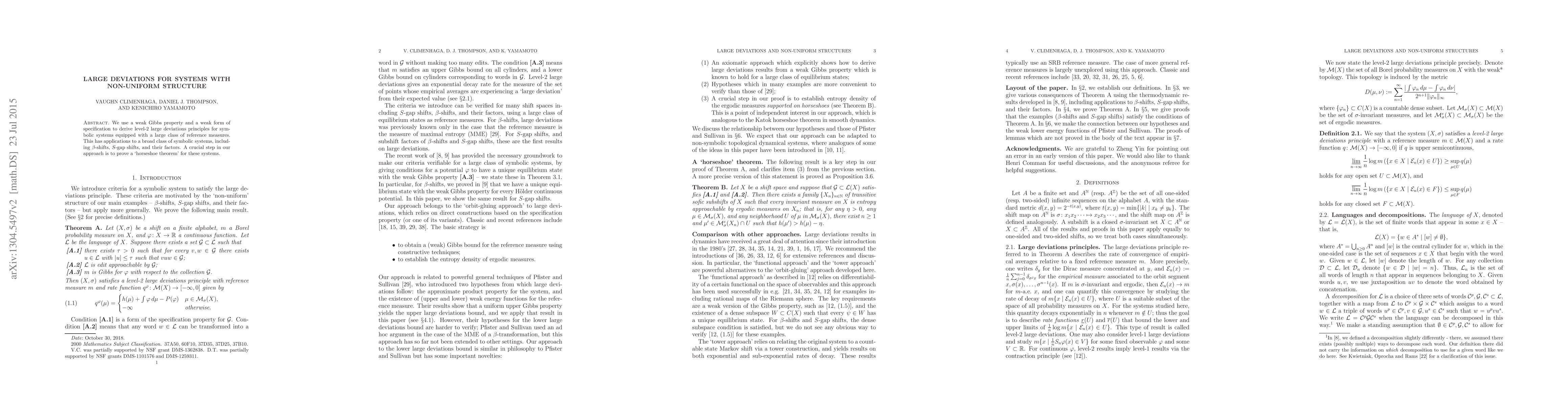 We use a weak Gibbs property and a weak form of specification to derive level-2 large deviations principles for symbolic systems equipped with a large class of reference measures. This has applications to a broad class of symbolic systems, including $\beta$-shifts, $S$-gap shifts, and their factors. A crucial step in our approach is to prove a `horseshoe theorem' for these systems.