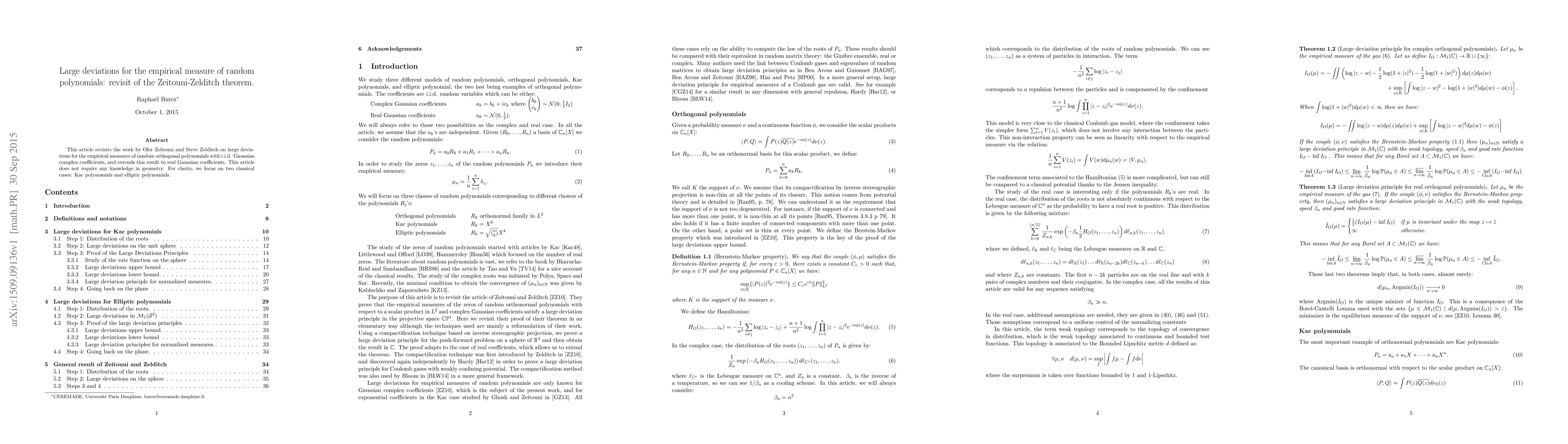 This article revisits the work by Ofer Zeitouni and Steve Zelditch on large deviations for the empirical measures of random orthogonal polynomials with i.i.d. Gaussian complex coefficients, and extends this result to real Gaussian coefficients. This article does not require any knowledge in geometry. For clarity, we focus on two classical cases: Kac polynomials and elliptic polynomials.