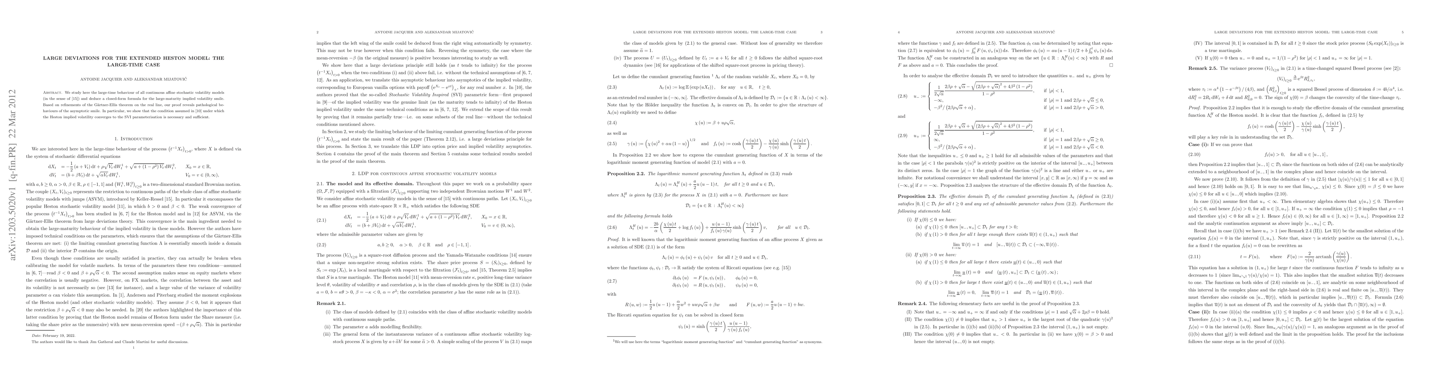 This research derives a closed-form formula for the large-maturity implied volatility smile in continuous affine stochastic volatility models, using refined Gartner-Ellis theorem. It reveals pathological behaviours of the asymptotic smile, proving the necessity and sufficiency of Gatheral and Jacquier's condition for Heston implied volatility convergence to SVI parameterization.