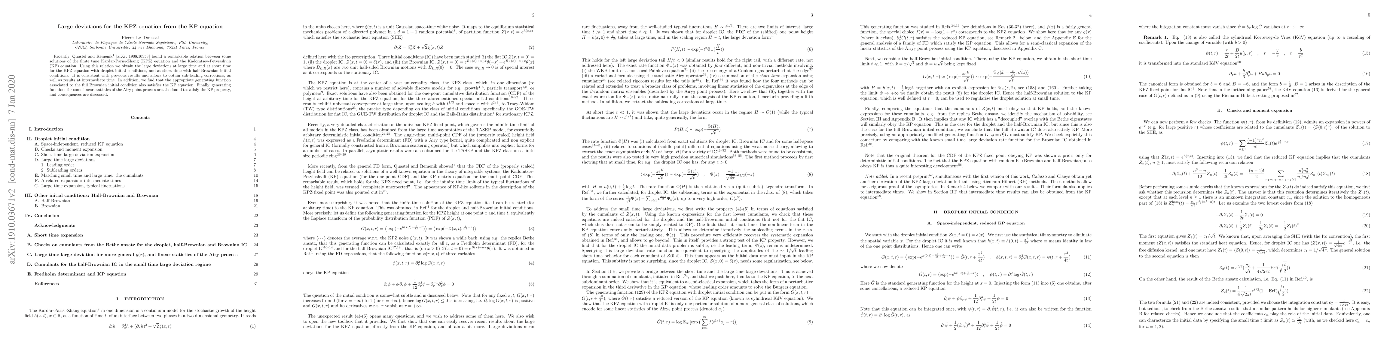 This paper explores large deviations for the KPZ equation using a relation between its solutions and the KP equation, revealing sub-leading corrections and intermediate time results. It also finds that generating functions for the full Brownian initial condition and linear statistics of the Airy point process satisfy the KP property.