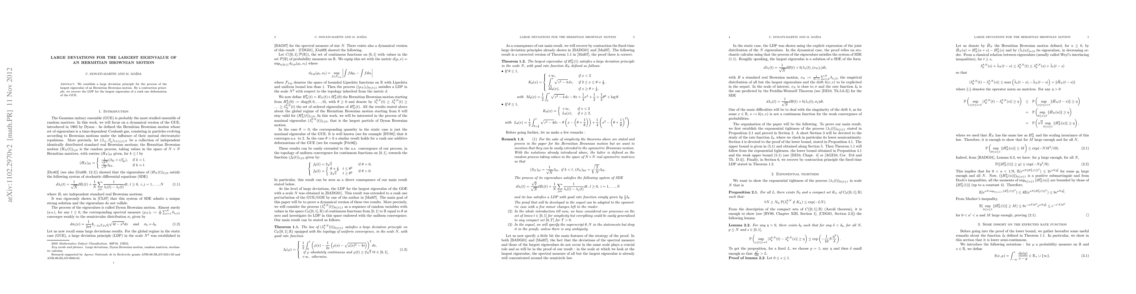 We establish a large deviation principle for the process of the largest eigenvalue of an Hermitian Brownian motion. By a contraction principle, we recover the LDP for the largest eigenvalue of a rank one deformation of the GUE.