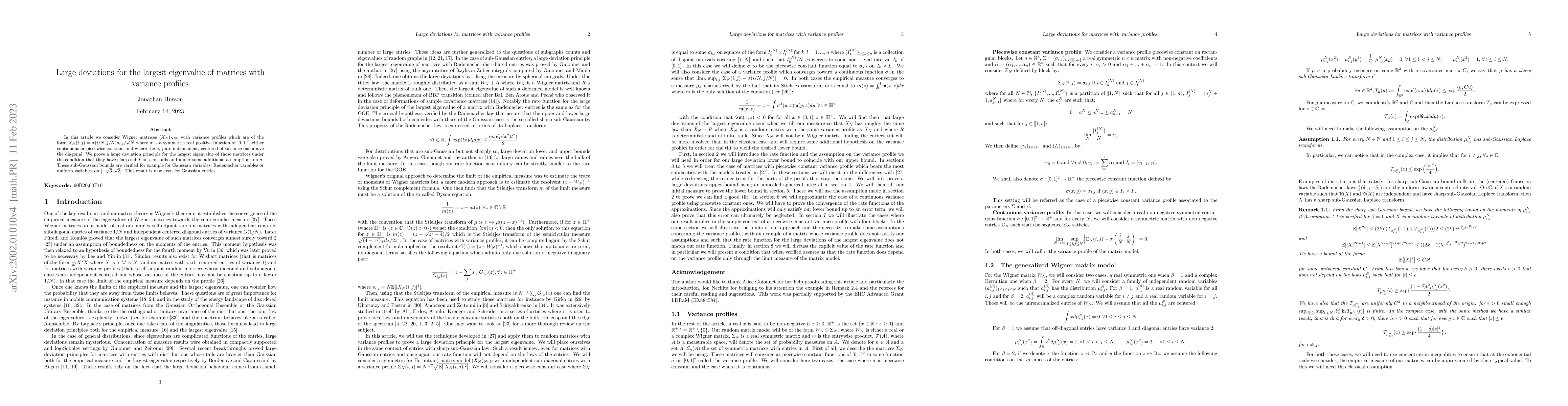 This paper investigates Wigner matrices with variance profiles, proving a large deviation principle for their largest eigenvalue under specific conditions, including sharp sub-Gaussian bounds, and verifies these bounds for Gaussian, Rademacher, and uniform variables.