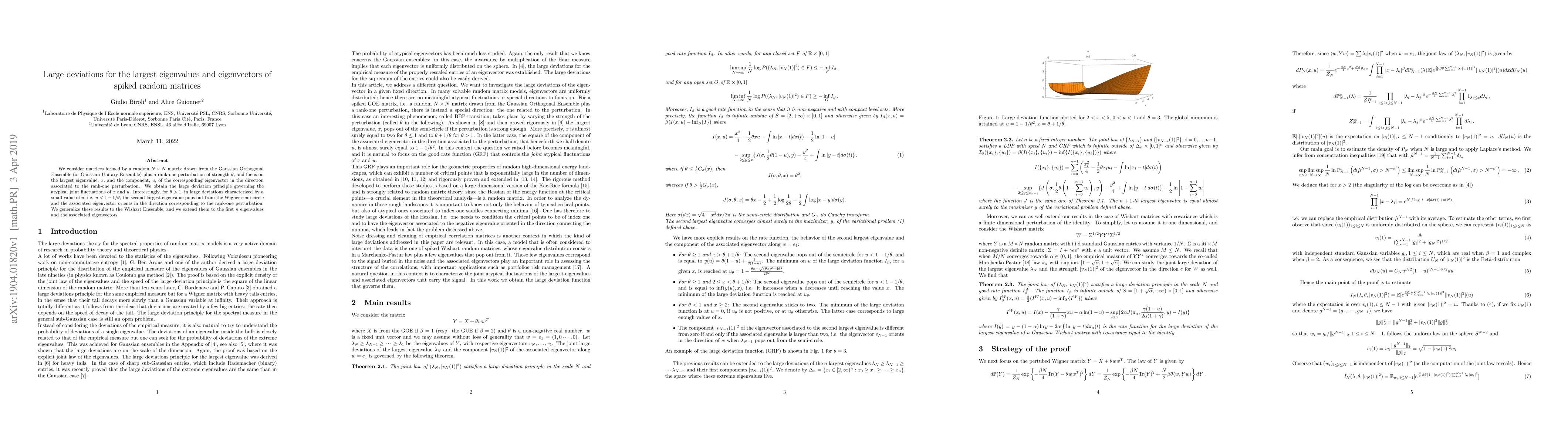 This research studies the largest eigenvalue and its corresponding eigenvector in spiked random matrices, deriving a large deviation principle for their fluctuations. It reveals that for sufficiently strong perturbations, the second-largest eigenvalue deviates significantly, especially for small eigenvector components in the direction of the perturbation. The findings are generalized to the Wishart Ensemble and extended to the first n eigenvalues and eigenvectors.