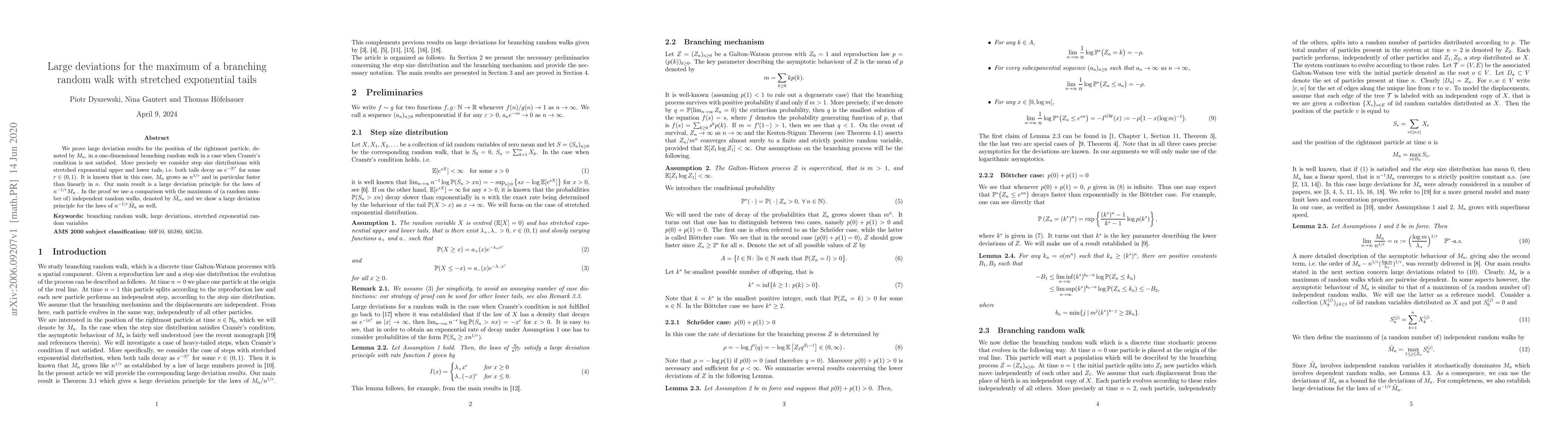 This paper establishes large deviation principles for the rightmost particle in a one-dimensional branching random walk with stretched exponential tails, proving that $M_n$ grows as $n^{1/r}$. The main result is a large deviation principle for $n^{-1/r}M_n$, using a comparison with the maximum of independent random walks.