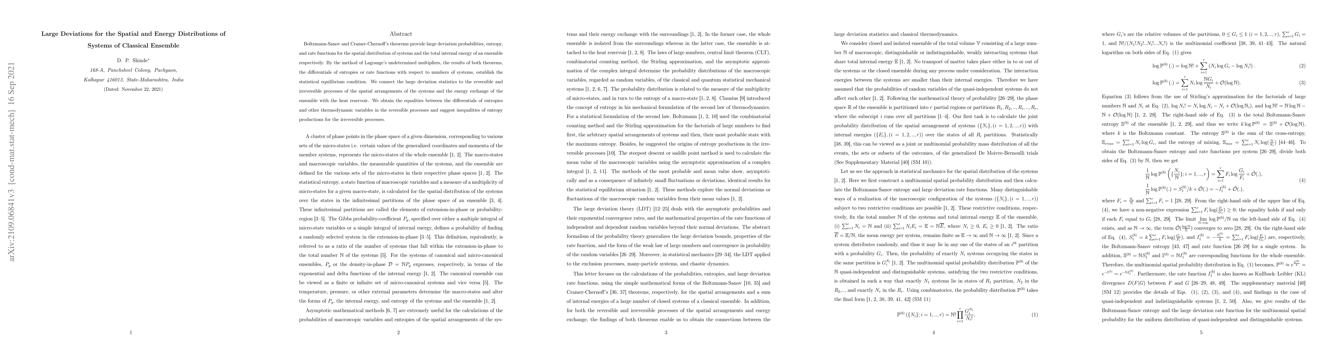 Boltzmann-Sanov and Cramer-Chernoff's theorems provide large deviation probabilities, entropy, and rate functions for the spatial distribution of systems and the total internal energy of an ensemble respectively. By the method of Lagrange's undetermined multipliers, the results of both theorems, the differentials of entropies or rate functions with respect to numbers of systems, establish the statistical equilibrium condition. We connect the large deviation statistics to the reversible and irreversible processes of the spatial arrangements of the systems and the energy exchange of the ensemble with the heat reservoir. We obtain the equalities between the differentials of entropies and other thermodynamic variables in the reversible processes and suggest inequalities of entropy productions for the irreversible processes.