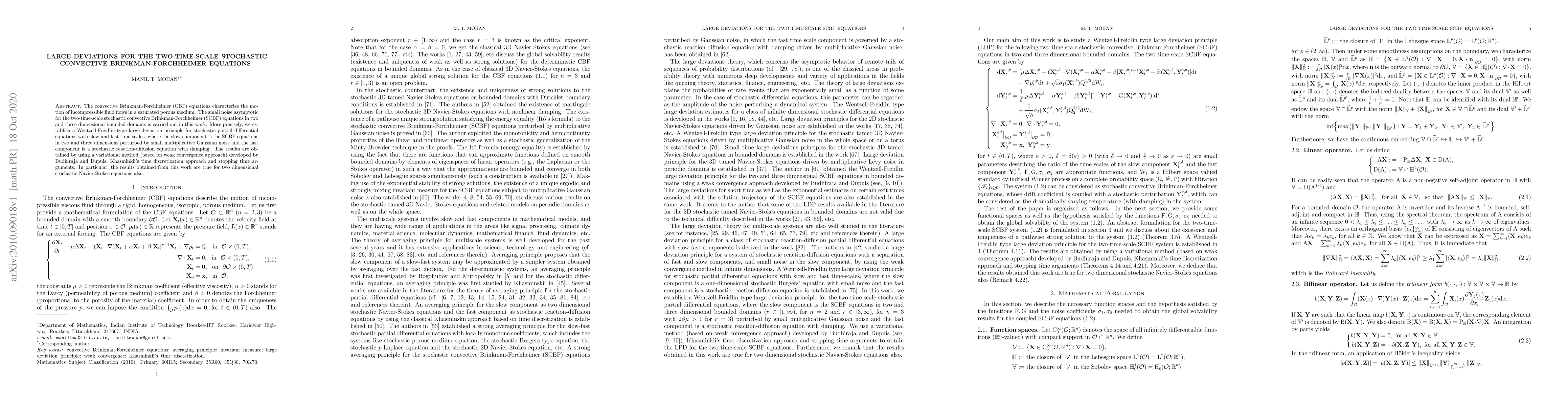 The convective Brinkman-Forchheimer (CBF) equations characterize the motion of incompressible fluid flows in a saturated porous medium. The small noise asymptotic for the two-time-scale stochastic convective Brinkman-Forchheimer (SCBF) equations in two and three dimensional bounded domains is carried out in this work. More precisely, we establish a Wentzell-Freidlin type large deviation principle for stochastic partial differential equations with slow and fast time-scales, where the slow component is the SCBF equations in two and three dimensions perturbed by small multiplicative Gaussian noise and the fast component is a stochastic reaction-diffusion equation with damping. The results are obtained by using a variational method (based on weak convergence approach) developed by Budhiraja and Dupuis, Khasminkii's time discretization approach and stopping time arguments. In particular, the results obtained from this work are true for two dimensional stochastic Navier-Stokes equations also.