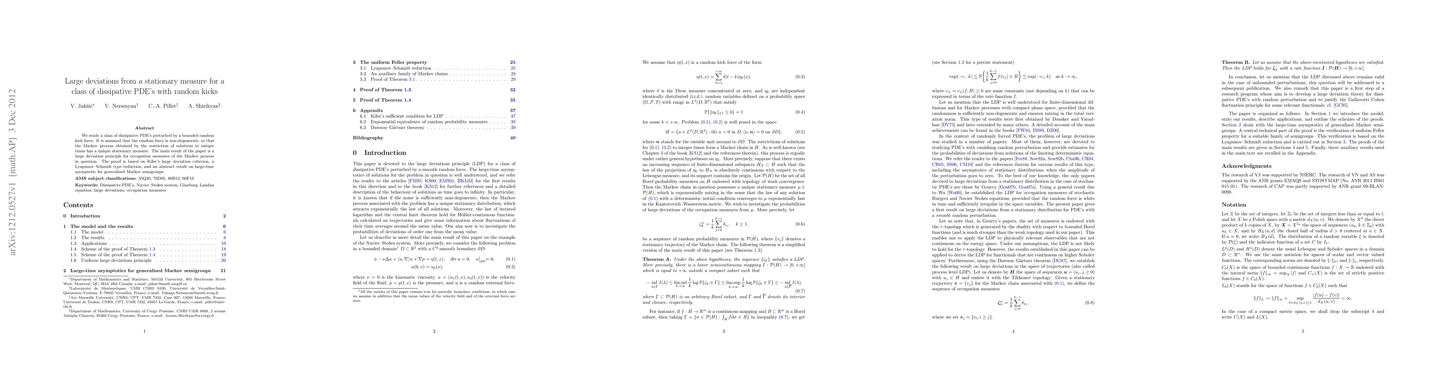 We study a class of dissipative PDE's perturbed by a bounded random kick force. It is assumed that the random force is non-degenerate, so that the Markov process obtained by the restriction of solutions to integer times has a unique stationary measure. The main result of the paper is a large deviation principle for occupation measures of the Markov process in question. The proof is based on Kifer's large deviation criterion, a Lyapunov-Schmidt type reduction, and an abstract result on large-time asymptotic for generalised Markov semigroups.