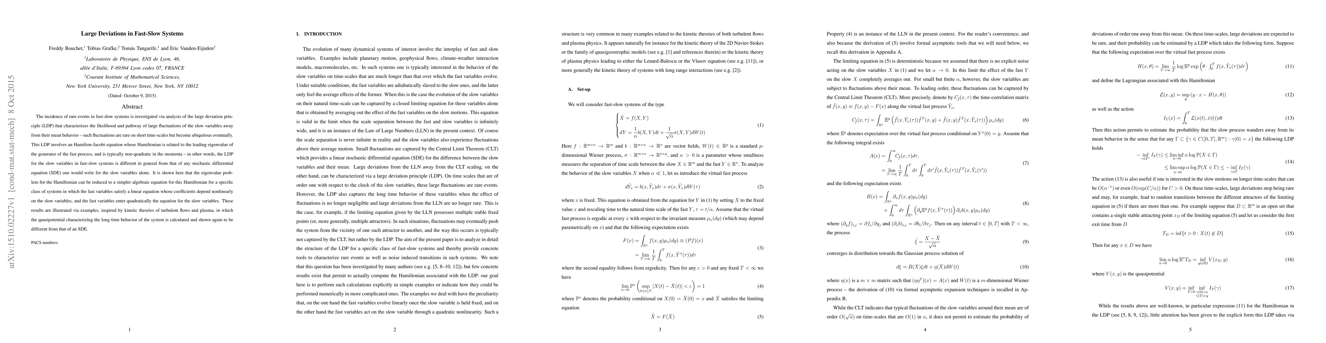 The paper presents a method to reduce the eigenvalue problem for the Hamiltonian in fast-slow systems to a simpler algebraic equation under specific conditions, providing a novel approach to study large deviations in such systems.