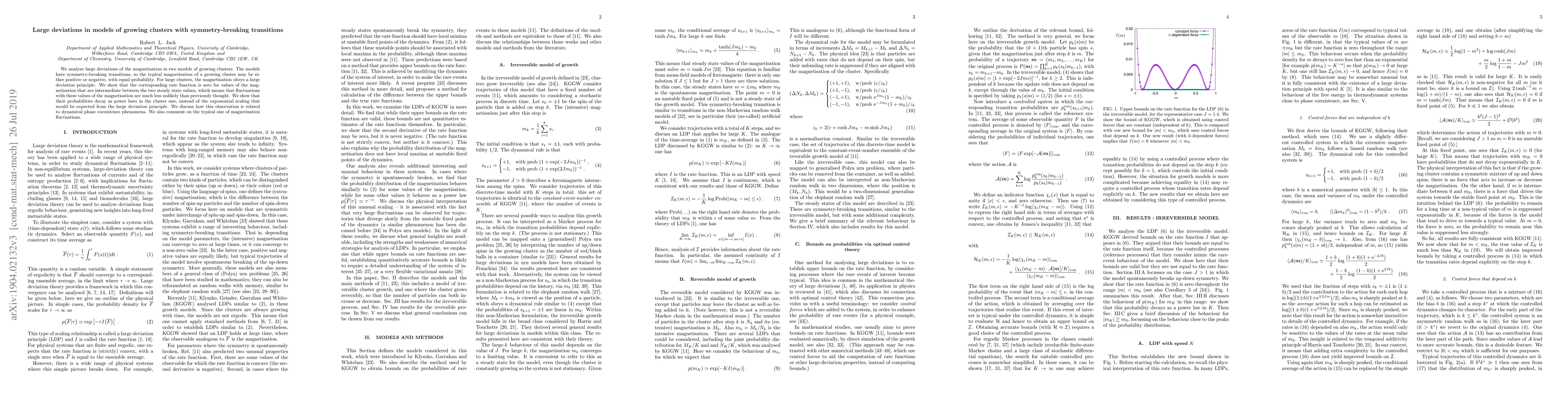 This paper investigates large deviations in magnetisation for growing clusters with symmetry-breaking transitions, revealing that intermediate magnetisation values are much less unlikely than expected. The probabilities of these fluctuations decay as power laws rather than exponentials, linking this to dynamical phase coexistence phenomena.