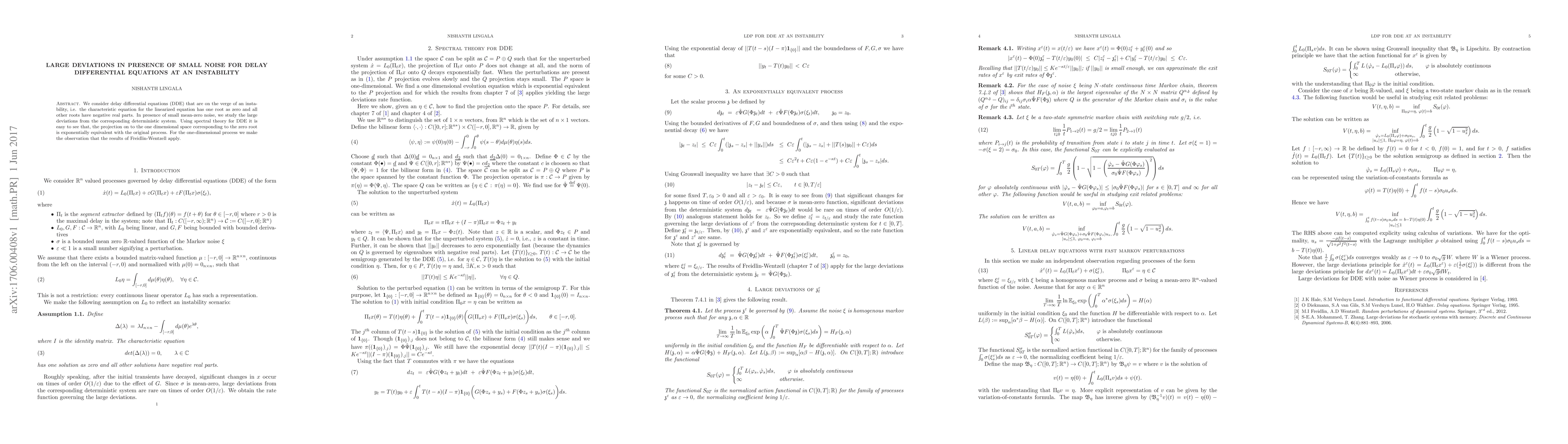 We consider delay differential equations (DDE) that are on the verge of an instability, i.e. the characteristic equation for the linearized equation has one root as zero and all other roots have negative real parts. In presence of small mean-zero noise, we study the large deviations from the corresponding deterministic system. Using spectral theory for DDE it is easy to see that, the projection on to the one dimensional space corresponding to the zero root is exponentially equivalent with the original process. For the one-dimensional process we make the observation that the results of Freidlin-Wentzell apply.