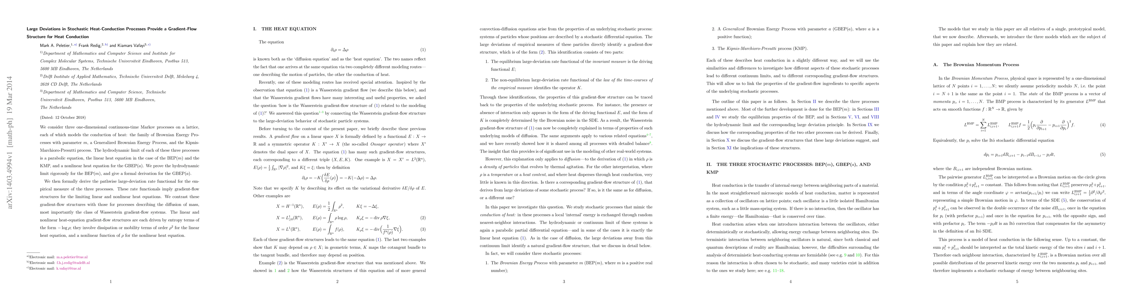 We consider three one-dimensional continuous-time Markov processes on a lattice, each of which models the conduction of heat: the family of Brownian Energy Processes with parameter $m$, a Generalized Brownian Energy Process, and the Kipnis-Marchioro-Presutti process. The hydrodynamic limit of each of these three processes is a parabolic equation, the linear heat equation in the case of the BEP$(m)$ and the KMP, and a nonlinear heat equation for the GBEP($a$). We prove the hydrodynamic limit rigorously for the BEP$(m)$, and give a formal derivation for the GBEP($a$). We then formally derive the pathwise large-deviation rate functional for the empirical measure of the three processes. These rate functionals imply gradient-flow structures for the limiting linear and nonlinear heat equations. We contrast these gradient-flow structures with those for processes describing the diffusion of mass, most importantly the class of Wasserstein gradient-flow systems. The linear and nonlinear heat-equation gradient-flow structures are each driven by entropy terms of the form $-\log \rho$; they involve dissipation or mobility terms of order $\rho^2$ for the linear heat equation, and a nonlinear function of $\rho$ for the nonlinear heat equation.
