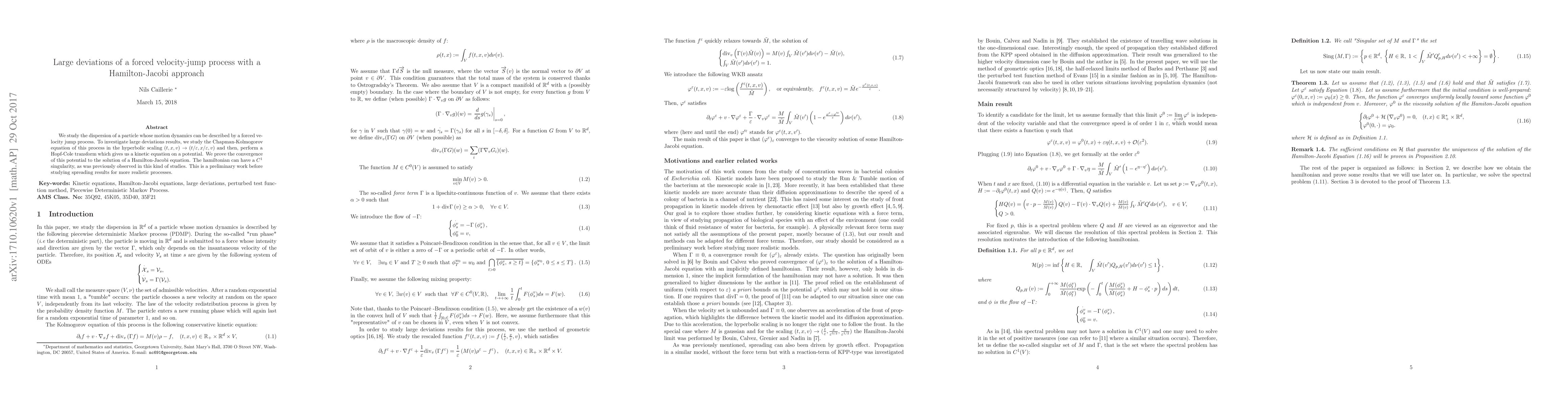 We study the dispersion of a particle whose motion dynamics can be described by a forced velocity jump process. To investigate large deviations results, we study the Chapman-Kolmogorov equation of this process in the hyperbolic scaling (t,x,v) -> (t/epsilon,x/epsilon,v) and then, perform a Hopf-Cole transform which gives us a kinetic equation on a potential. We prove the convergence of this potential to the solution of a Hamilton-Jacobi equation. The hamiltonian can have a C1 singularity, as was previously observed in this kind of studies. This is a preliminary work before studying spreading results for more realistic processes.