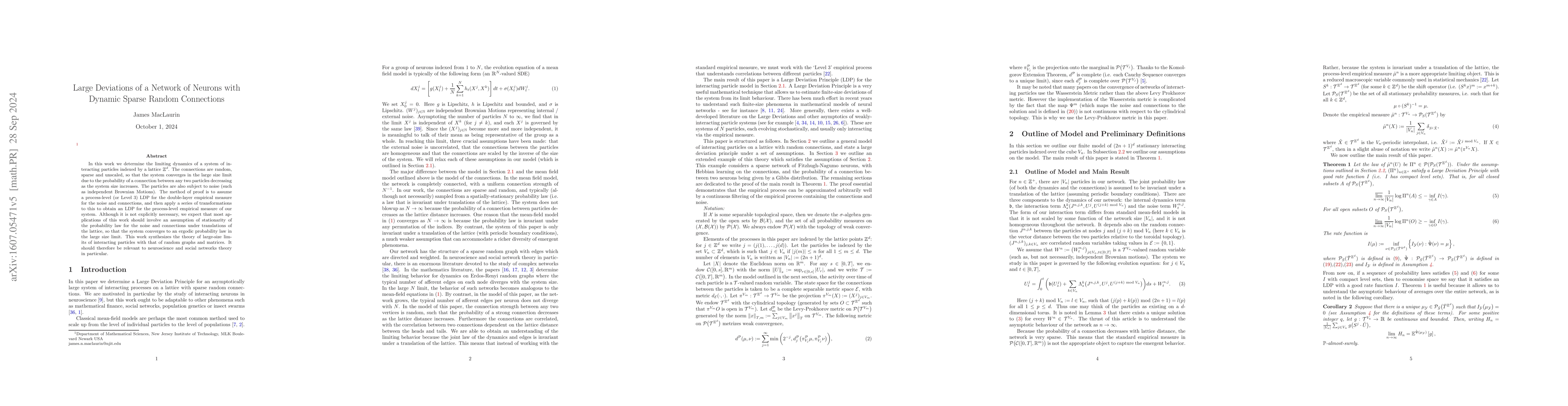 In this work we determine a process-level Large Deviation Principle (LDP) for a model of interacting particles indexed by a lattice $\mathbb{Z}^d$. The connections are random, sparse and unscaled, so that the system converges in the large size limit due to the probability of a connection between any two particles decreasing as the system size increases. The particles are also subject to noise (such as independent Brownian Motions). The method of proof is to assume a process-level (or Level 3) LDP for the double-layer empirical measure for the noise and connections, and then apply a series of transformations to this to obtain an LDP for the process-level empirical measure of our system. Although it is not explicitly necessary, we expect that most applications of this work should involve an assumption of stationarity of the probability law for the noise and connections under translations of the lattice, so that the system converged to an ergodic probability law in the large size limit. This work synthesizes the theory of large-size limits of interacting particles with that of random graphs and matrices. It should therefore be relevant to neuroscience and social networks theory in particular.