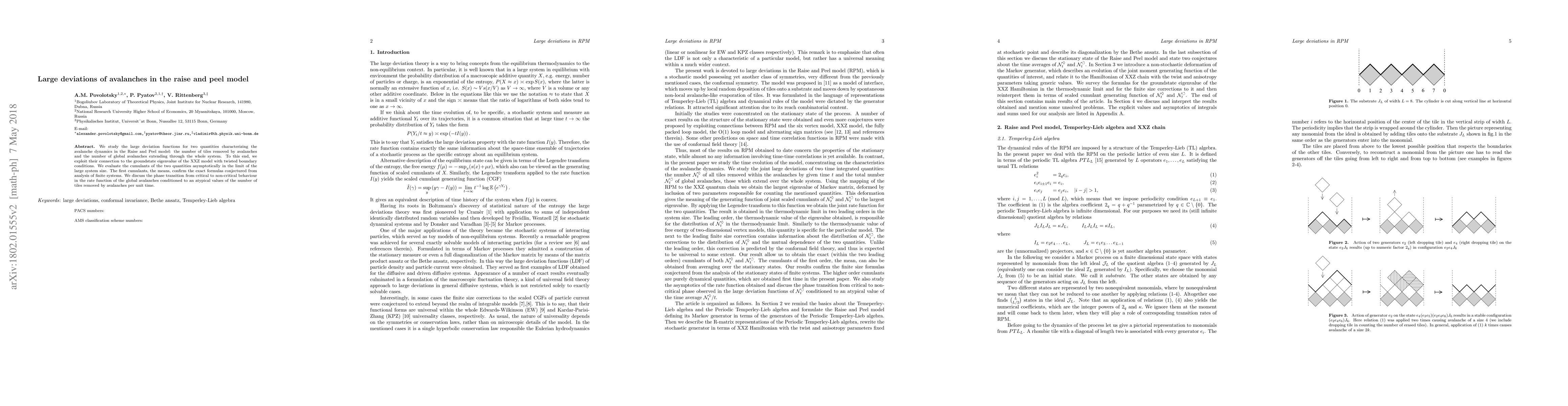 We study the large deviation functions for two quantities characterizing the avalanche dynamics in the Raise and Peel model: the number of tiles removed by avalanches and the number of global avalanches extending through the whole system. To this end, we exploit their connection to the groundstate eigenvalue of the XXZ model with twisted boundary conditions. We evaluate the cumulants of the two quantities asymptotically in the limit of the large system size. The first cumulants, the means, confirm the exact formulas conjectured from analysis of finite systems. We discuss the phase transition from critical to non-critical behaviour in the rate function of the global avalanches conditioned to an atypical values of the number of tiles removed by avalanches per unit time.