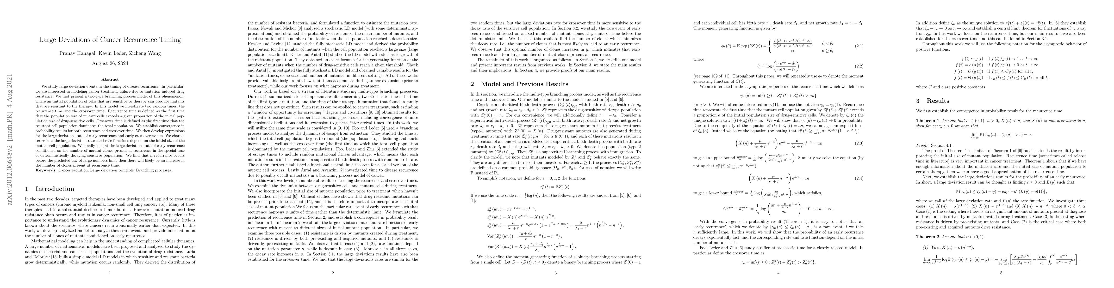 This paper models cancer recurrence timing using a branching process, focusing on mutation-induced drug resistance. It examines recurrence and crossover times, establishing convergence results and developing expressions for large deviations, showing that early recurrence often correlates with an increased number of mutant clones.