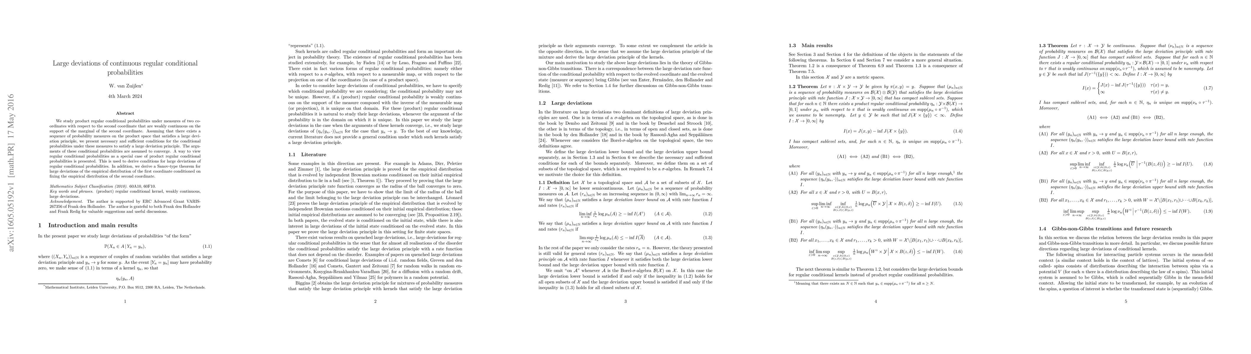 This paper investigates large deviations of product regular conditional probabilities under weakly continuous measures, establishing necessary and sufficient conditions for these probabilities to satisfy a large deviation principle. It also presents a Sanov-type theorem for large deviations of the empirical distribution of one coordinate conditioned on the other.