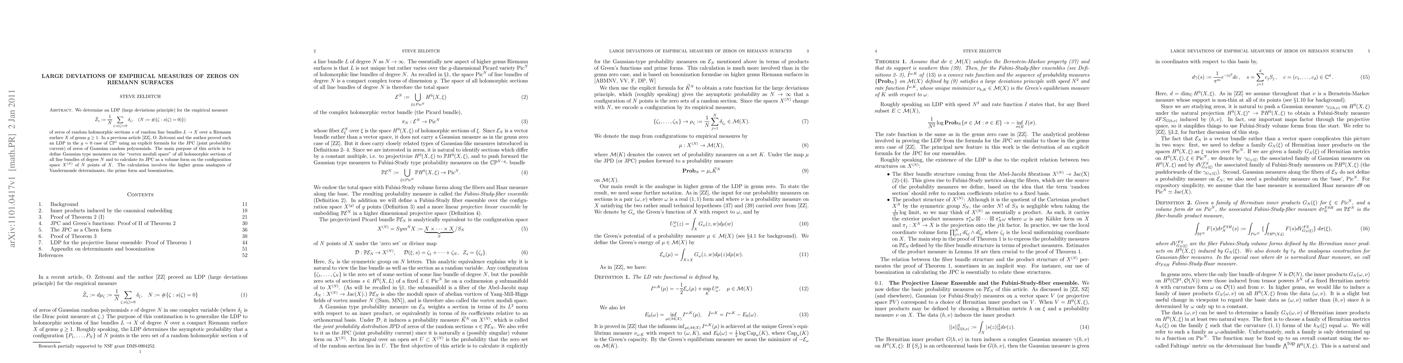 This is a continuation of a project on large deviations for the empirical measures of zeros of random holomorphic sections of random line bundles over a Riemann surface X. In a previous article with O. Zeitouni (arXiv:0904.4271), we proved an LDP for random polynomials in the genus zero case. In higher genus, there is a Picard variety of line bundles and so the line bundle L is a random variable as well as the section s. The space of pairs (L, s) is known as the "vortex moduli space". The zeros of (L, s) fill out the configuration space $X^{(N)}$ of $N$ points of $X$. The LDP shows that the configurations concentrate at one equilibrium measure exponentially fast. The new features of the proof involve Abel-Jacobi theory, the prime form and bosonization.
