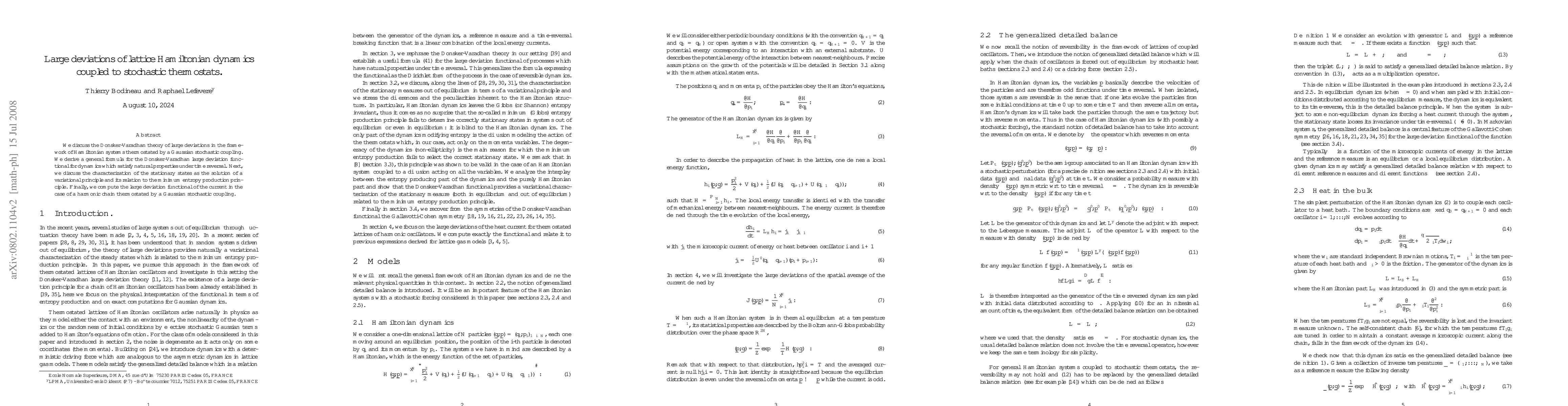 The paper applies Donsker-Varadhan theory to Hamiltonian systems with Gaussian stochastic thermostatting, deriving a general large deviation functional. It also explores the stationary state via a variational principle linked to minimal entropy production, and calculates the large deviation functional for a harmonic chain under such thermostatting.