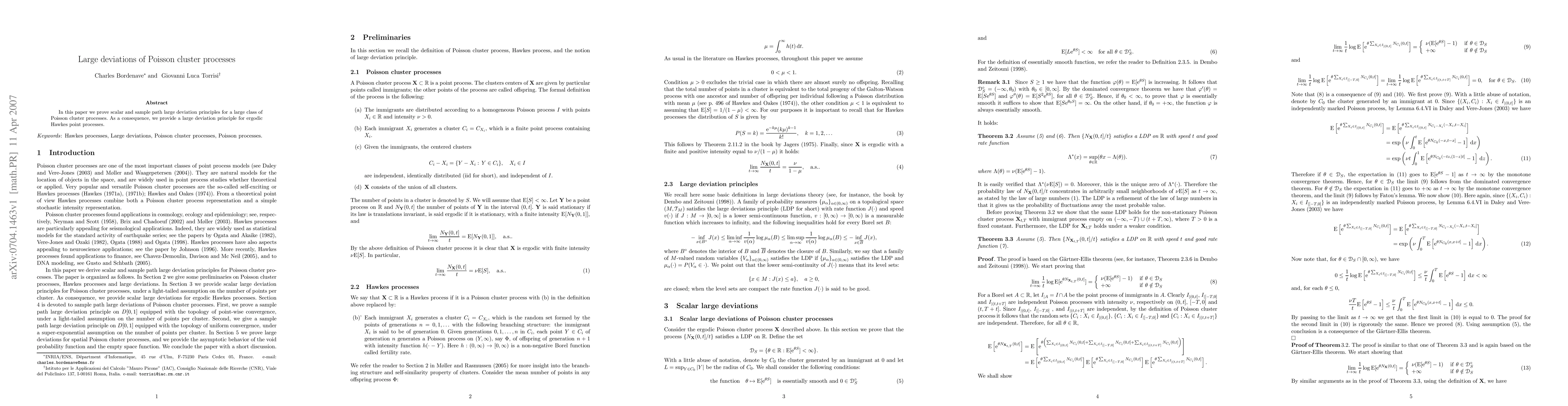 This paper establishes scalar and sample path large deviation principles for Poisson cluster processes, leading to a large deviation principle for ergodic Hawkes point processes. The findings contribute to understanding the probabilistic behavior of these processes under extreme conditions.