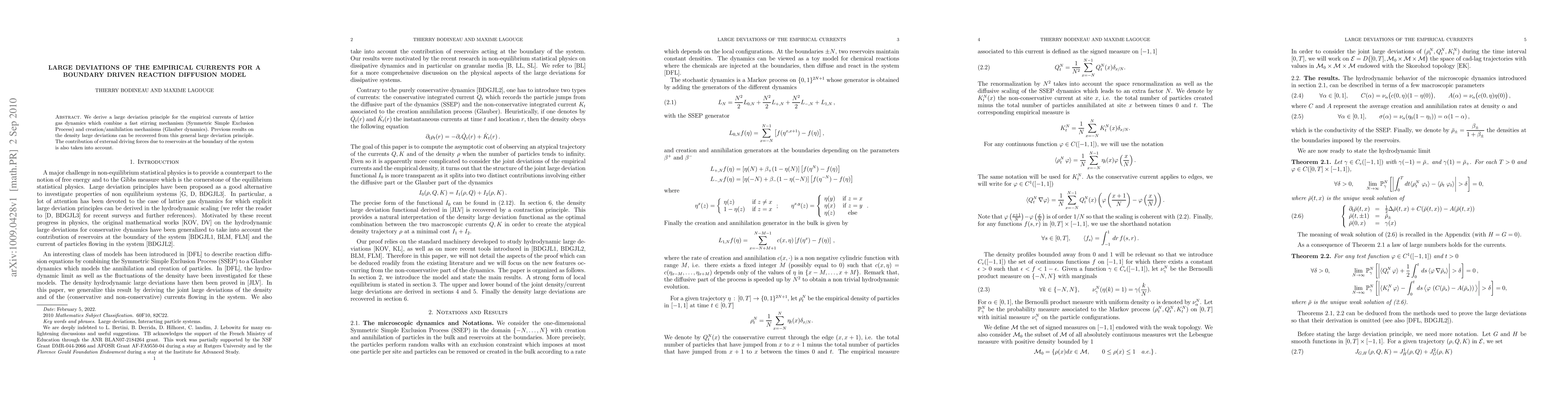 Researchers developed a large deviation principle for empirical currents in a reaction diffusion model with fast stirring and creation/annihilation mechanisms, which explains the system's density behavior and boundary effects.