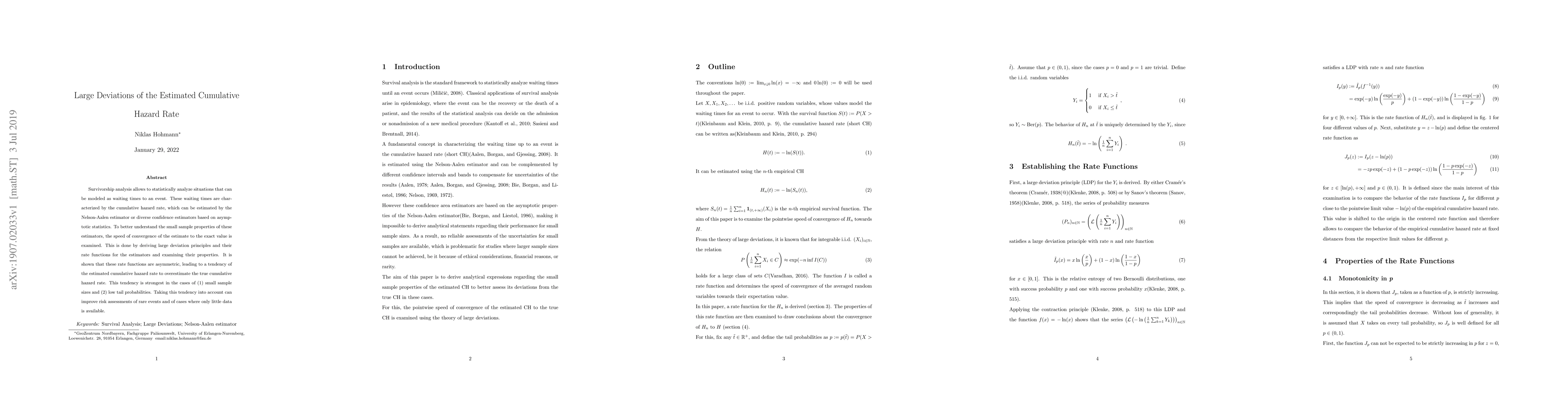 This paper investigates the small sample properties of cumulative hazard rate estimators, revealing that they tend to overestimate the true rate, especially in small samples and low tail probabilities. The study derives large deviation principles to understand this behavior, which can enhance risk assessments for rare events and data-scarce scenarios.