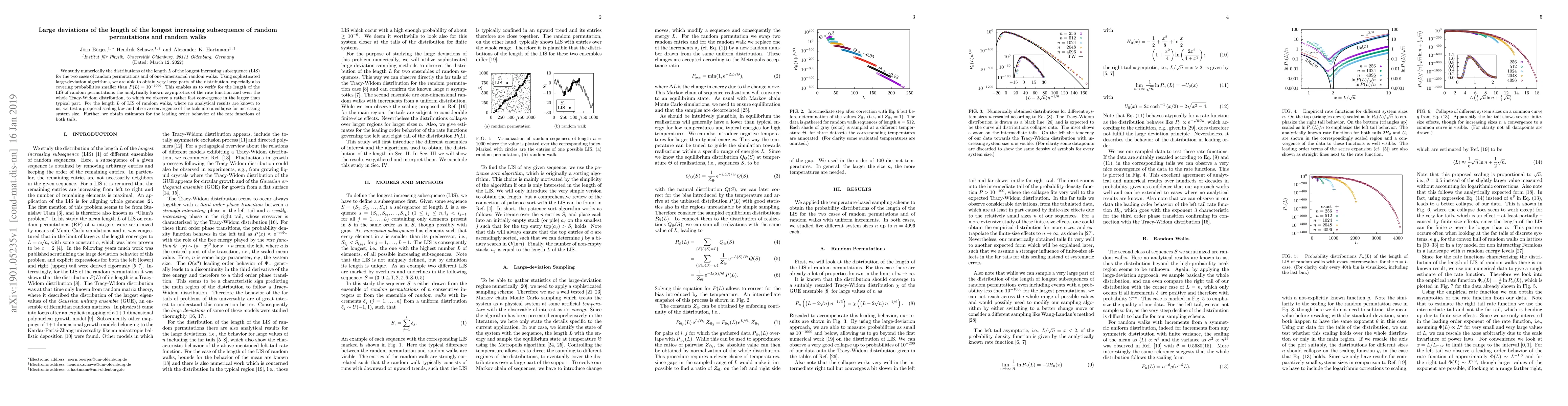 This paper numerically investigates the distributions of the longest increasing subsequence (LIS) length $L$ in random permutations and one-dimensional random walks, employing large-deviation techniques to explore probabilities as low as $P(L) = 10^{-1000}$. It verifies the known asymptotics and Tracy-Widom distribution for random permutations and tests a proposed scaling law for random walks, observing convergence and estimating rate functions for both cases.