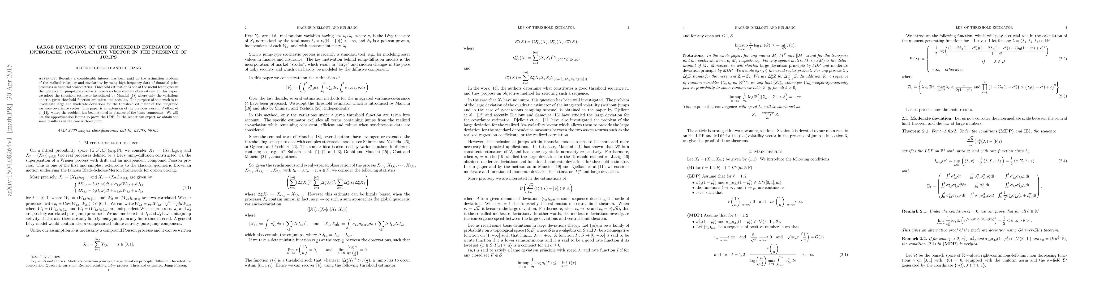 This paper investigates the large deviations properties of the threshold estimator for integrated variance-covariance vectors in financial econometrics, focusing on jump-type stochastic processes. It extends previous work by incorporating the jump component and proving large deviation principles using the approximation lemma.